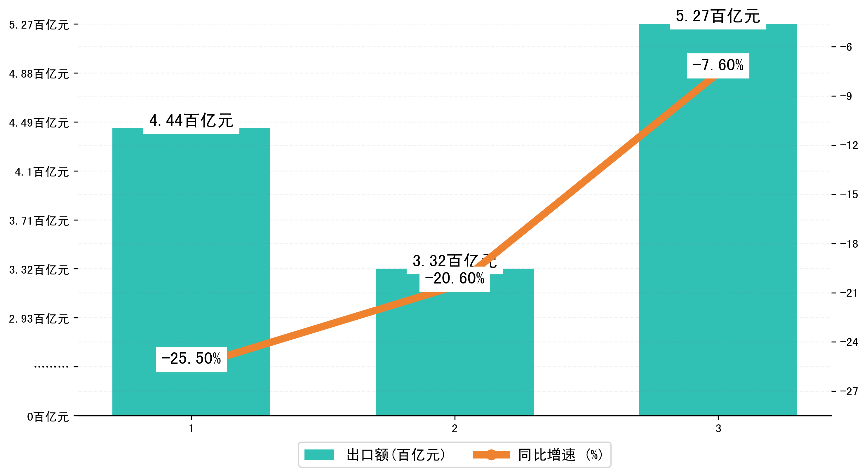 以人民币计,2023年3月广州市出口额为526,9351.1571万元,相比上月增加了194,5820.841万元;相比上年同期增加了97,4182.5485万元,同比减少了-7.60%。