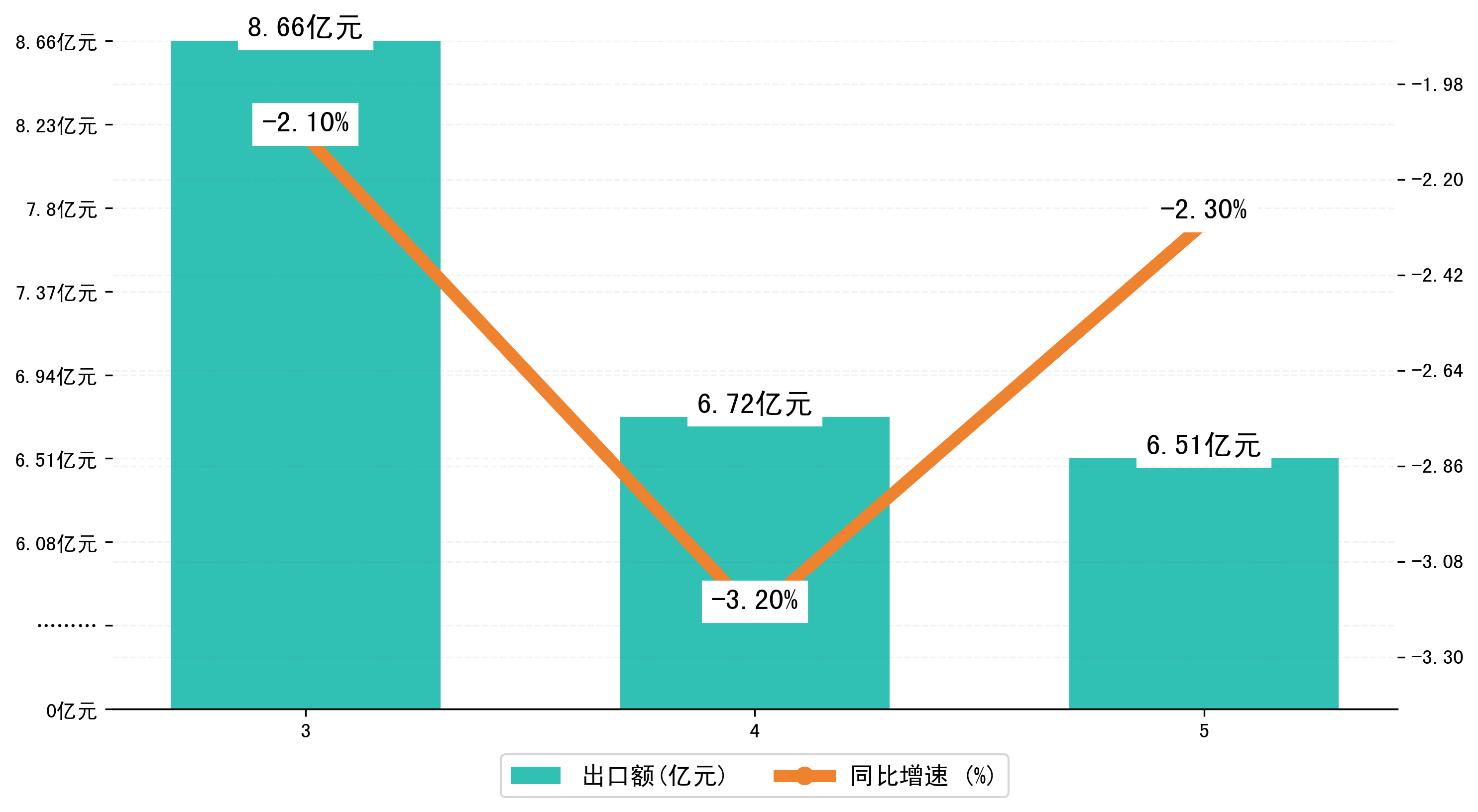 以人民币计,2023年5月桂林市出口额为6,5116.6913万元,相比上月减少了2129.7229万元;相比上年同期增加了1242.4853万元,同比减少了-2.30%。