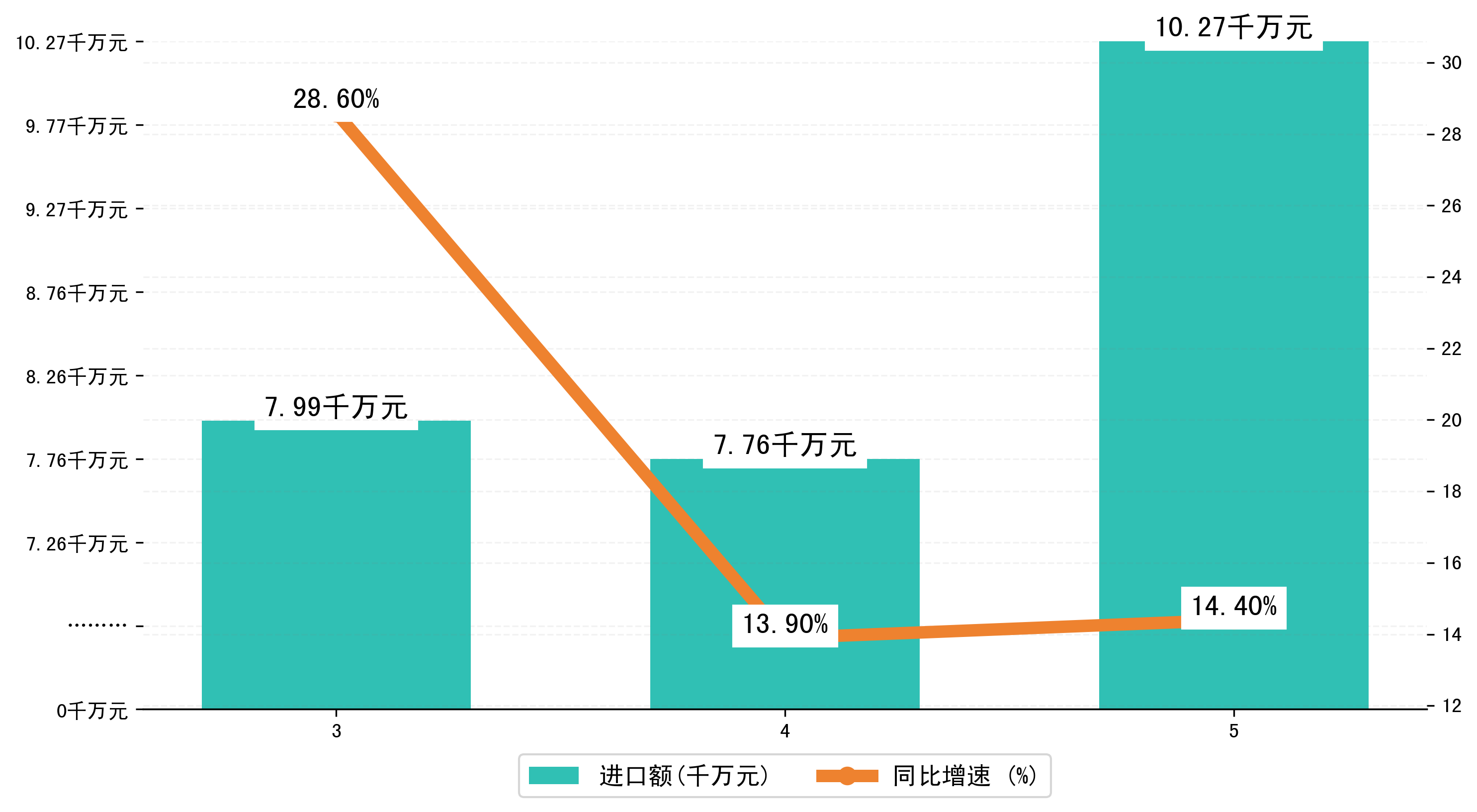 以人民币计,2023年1-5月桂林市进口额为3,6575.6619万元,相比上年同期增加了4613.4855万元,同比增加了14.40%。