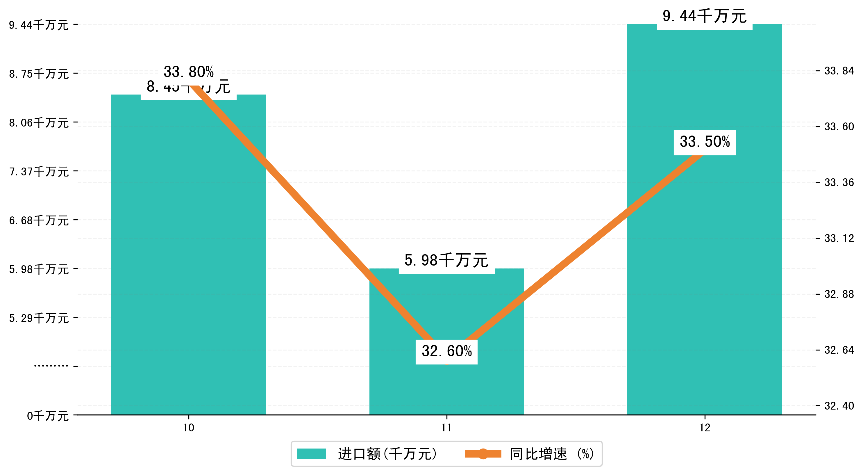 以人民币计,2023年12月桂林市进口额为9444.3817万元,相比上月增加了3459.9965万元;相比上年同期增加了2833.8024万元,同比增加了33.50%。