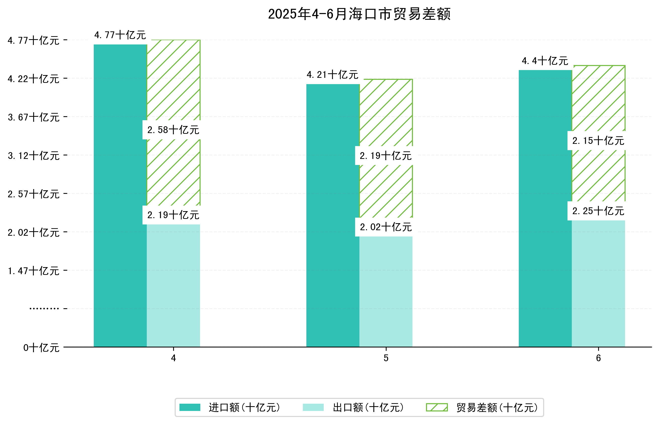 以人民币计,2025年6月海口市贸易差额为21,5326,0141万元(贸易逆差),相比上月增加了3306,3729万元,即409,3165万美元;相比上年同期减少了4,5436,6201万元,同比减少26.74%。