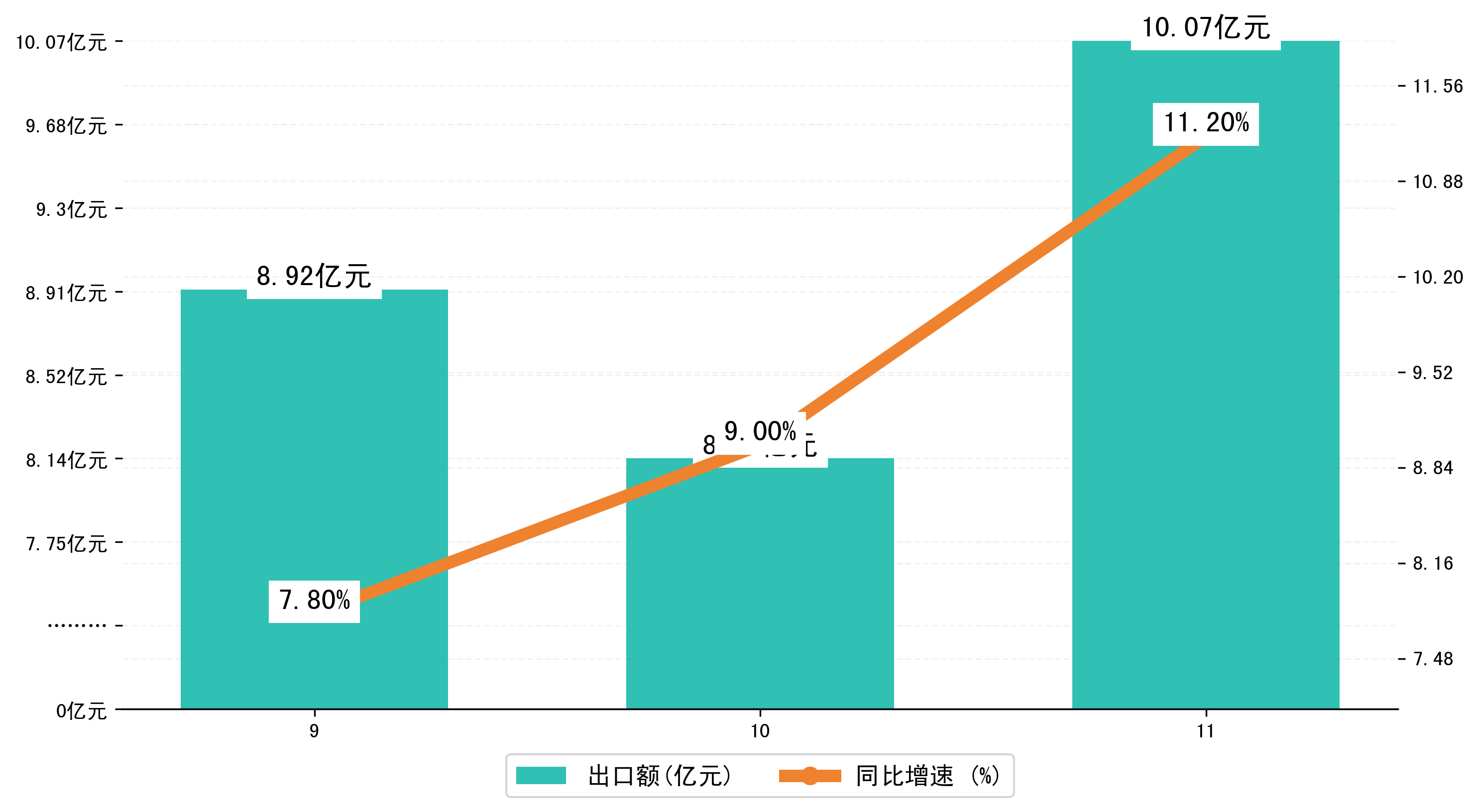 以美元计,2024年11月桂林市出口额为1,4164.8189万美元,相比上月增加了2680.9194万美元;相比上年同期增加了3691.7523万美元,同比增加9.80%。