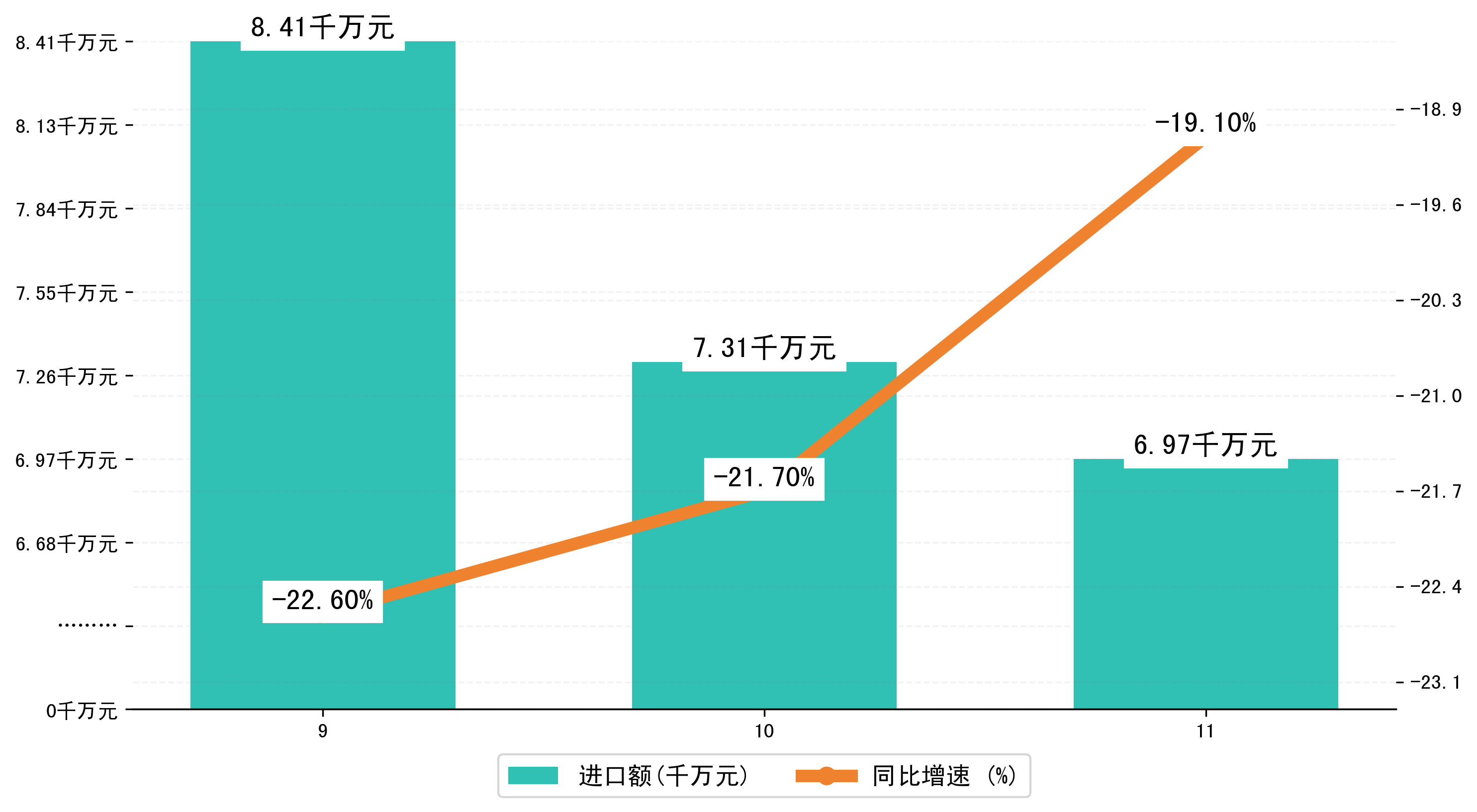 以人民币计,2024年1-11月桂林市进口额为7,1721.6065万元,相比上年同期减少了1,6960.8139万元,同比减少了-19.10%。