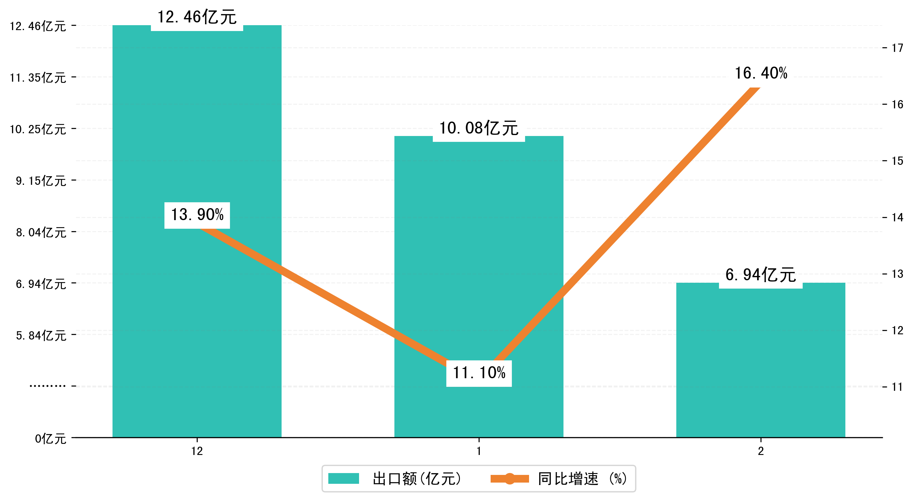 以美元计,2025年1-2月桂林市进出口总额为2,6206.387万美元,相比上年同期增加了3903.1723万美元,同比增加17.50%。