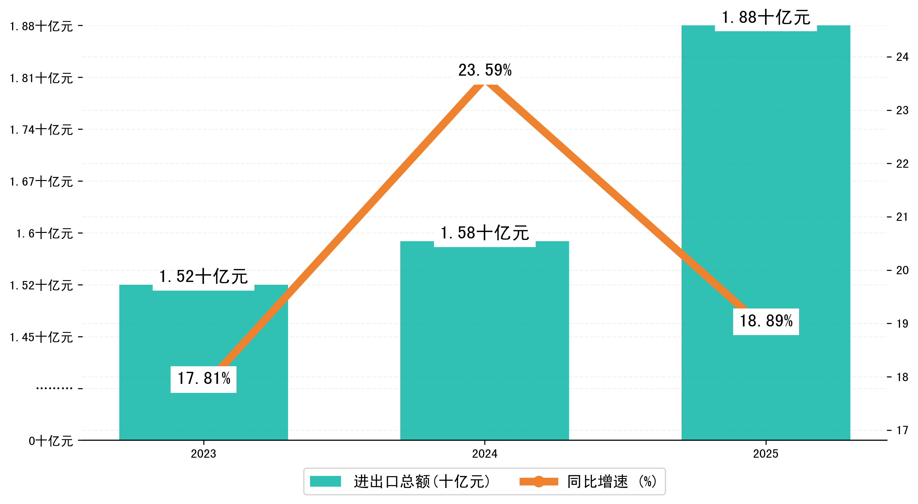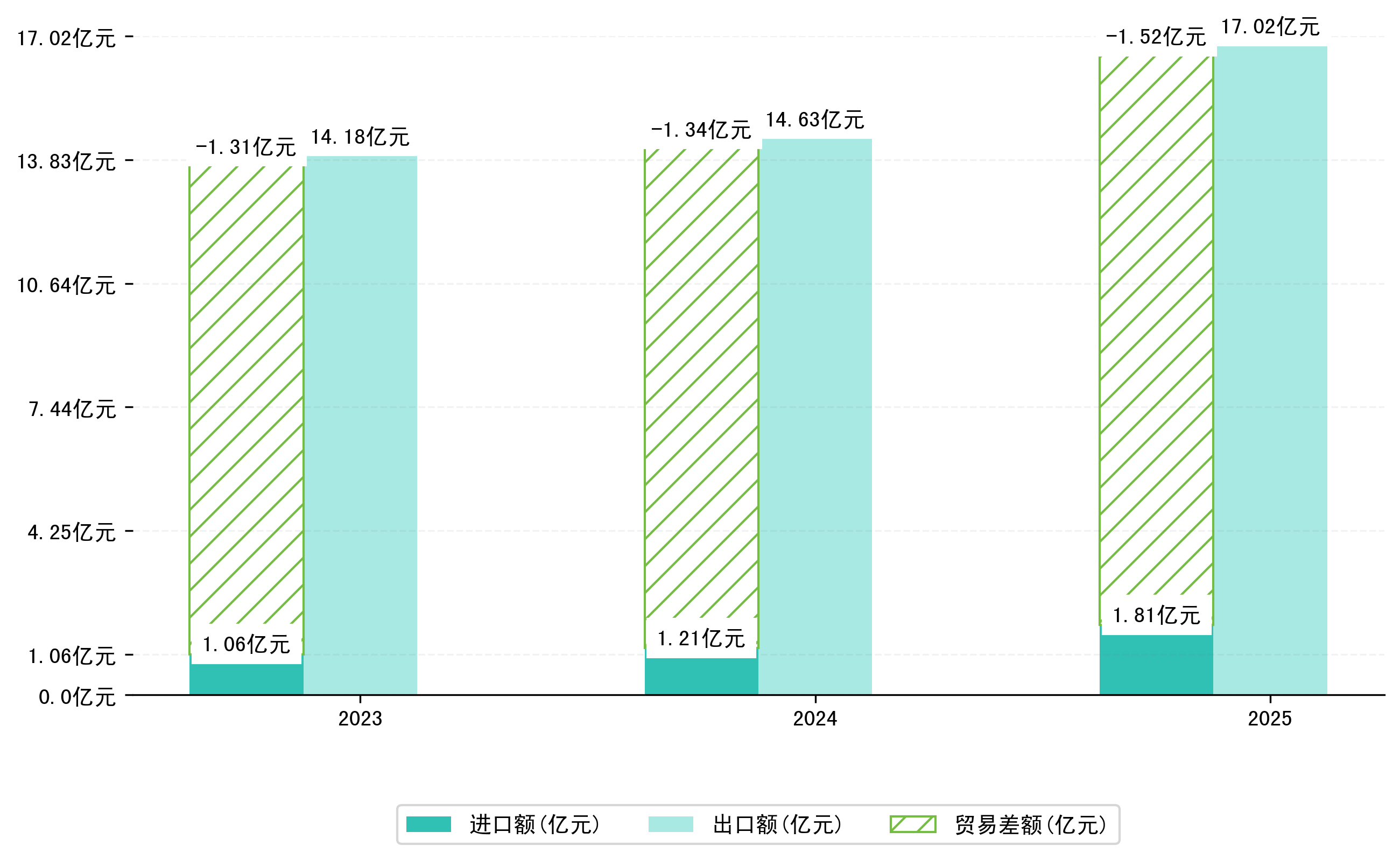 以人民币计,2025年1-2月桂林市贸易差额为15,2129,7891万元(贸易顺差),相比上年同期增加了1,7996,2033万元,同比增加13.42%。