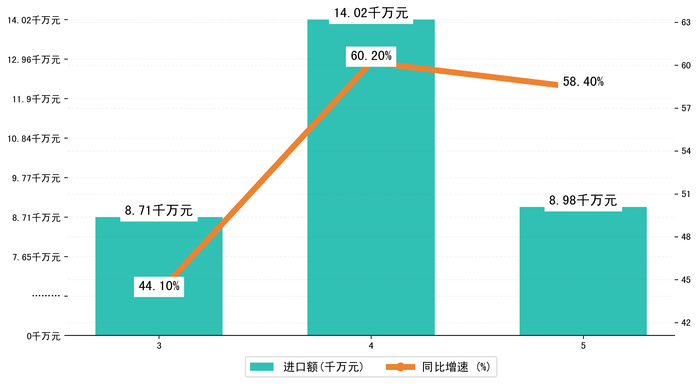 以人民币计,2025年5月桂林市进口额为8982.5944万元,相比上月减少了5040.8398万元;相比上年同期增加了3018.8749万元,同比增加了58.40%。