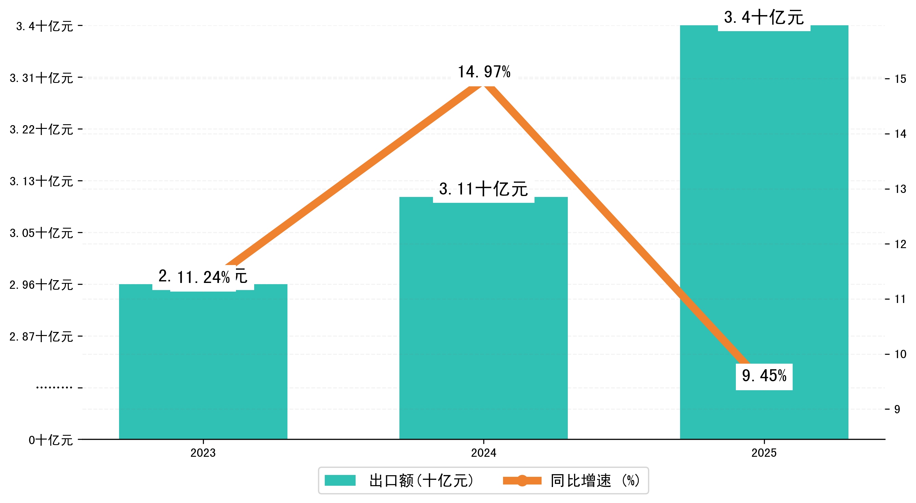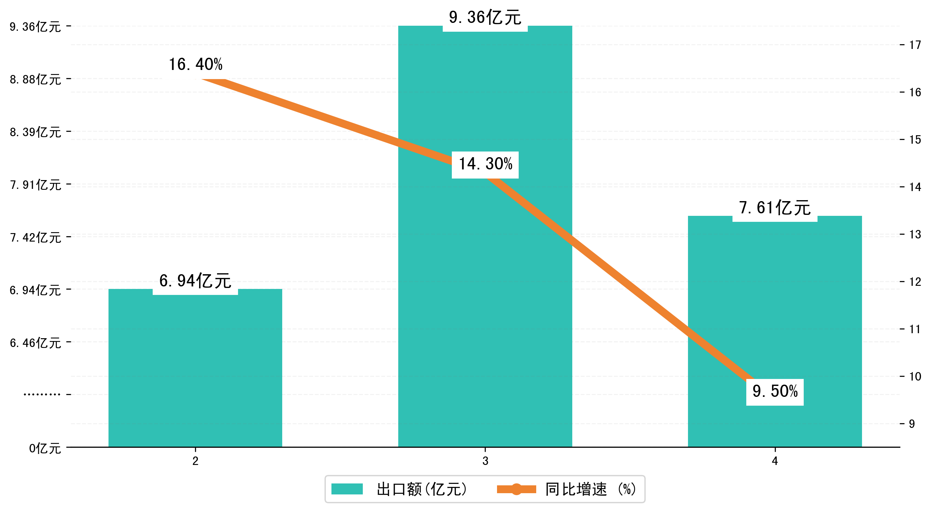 以人民币计,2025年1-4月桂林市出口额为33,9975.797万元,相比上年同期增加了2,9353.3251万元,同比增加了9.50%。
