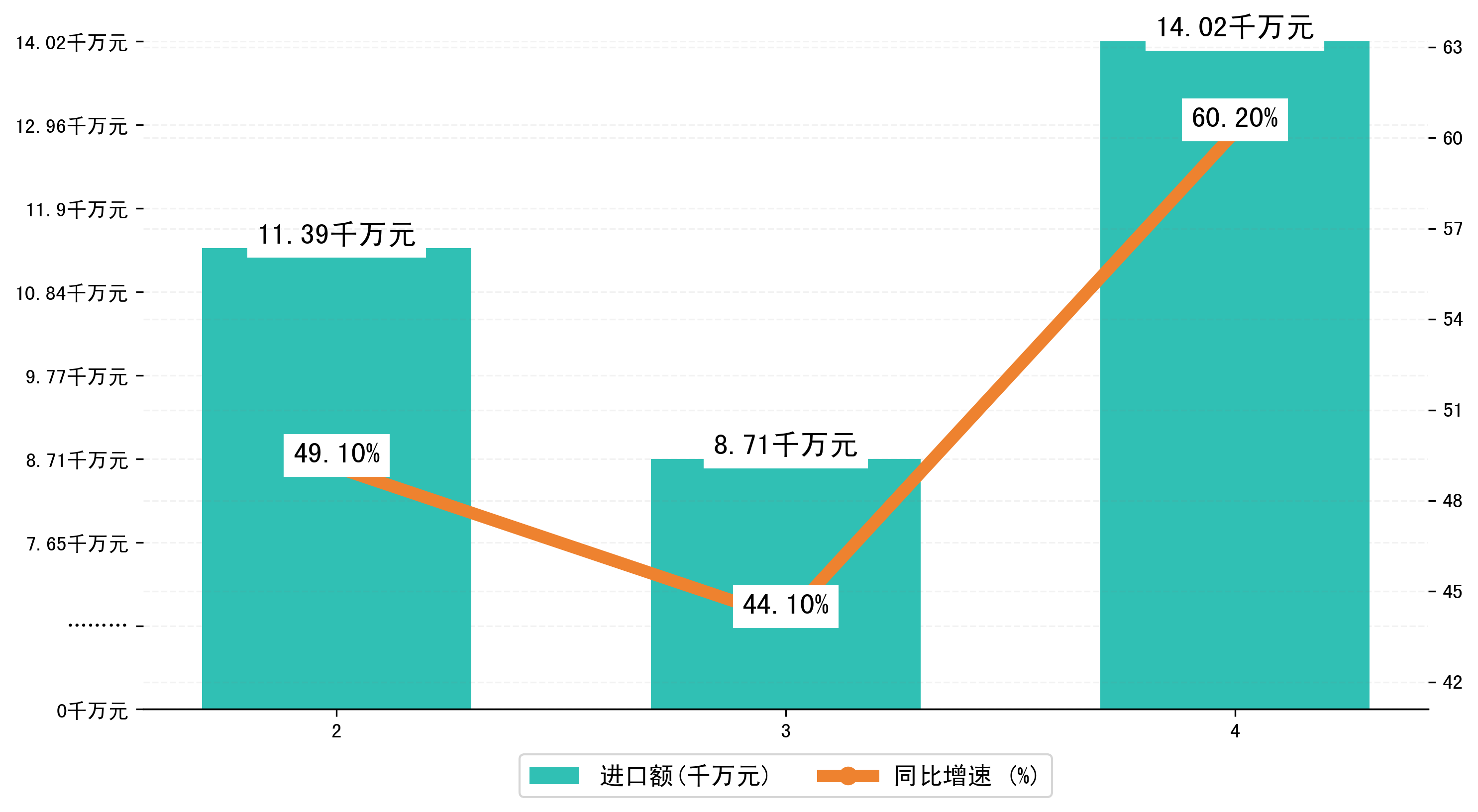 以人民币计,2025年1-4月桂林市进口额为4,0846.8537万元,相比上年同期增加了1,4716.8729万元,同比增加了60.20%。