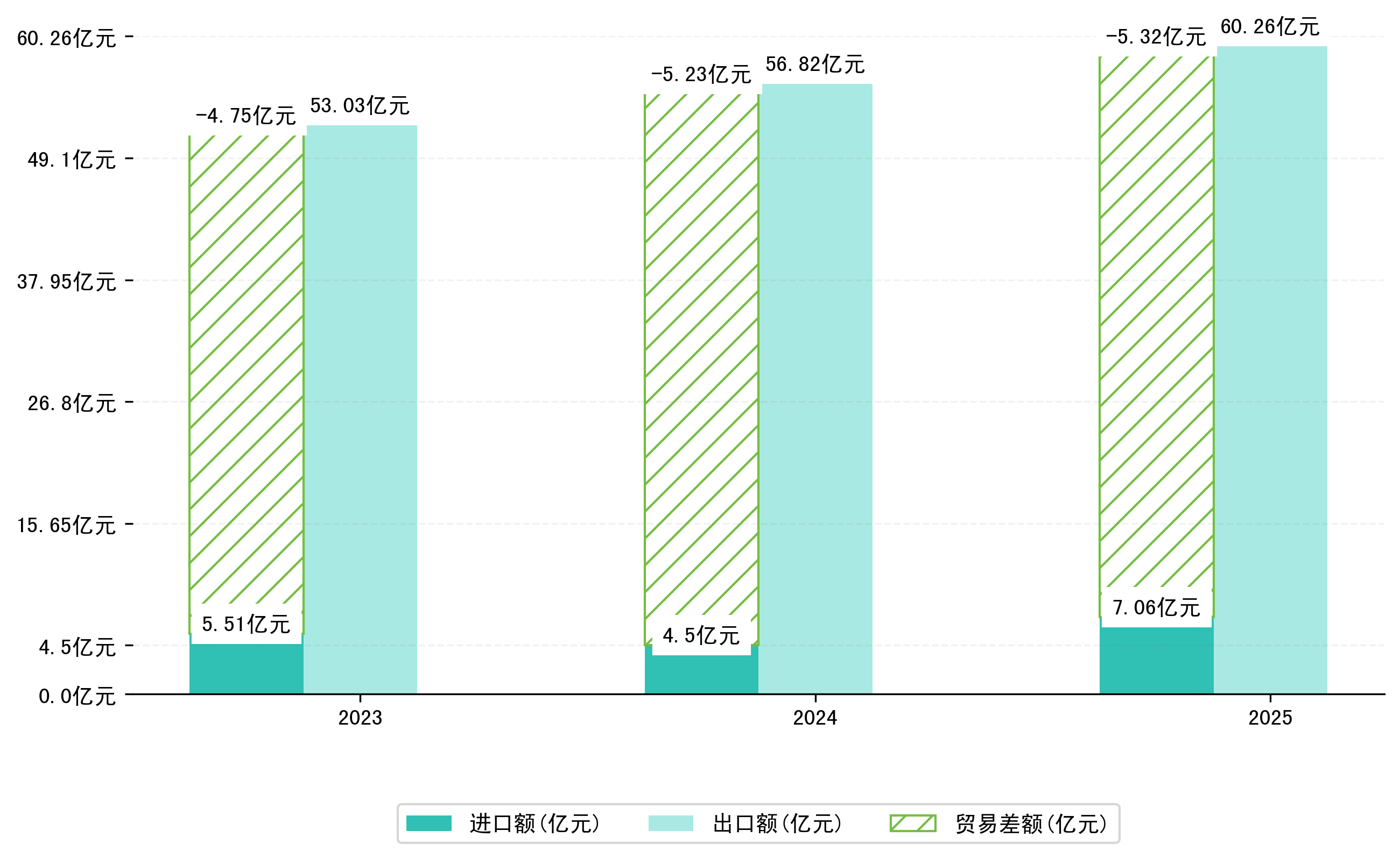 以人民币计,2025年1-7月桂林市贸易差额为53,1974,4215万元(贸易顺差),相比上年同期增加了8763,9615万元,同比增加1.68%。