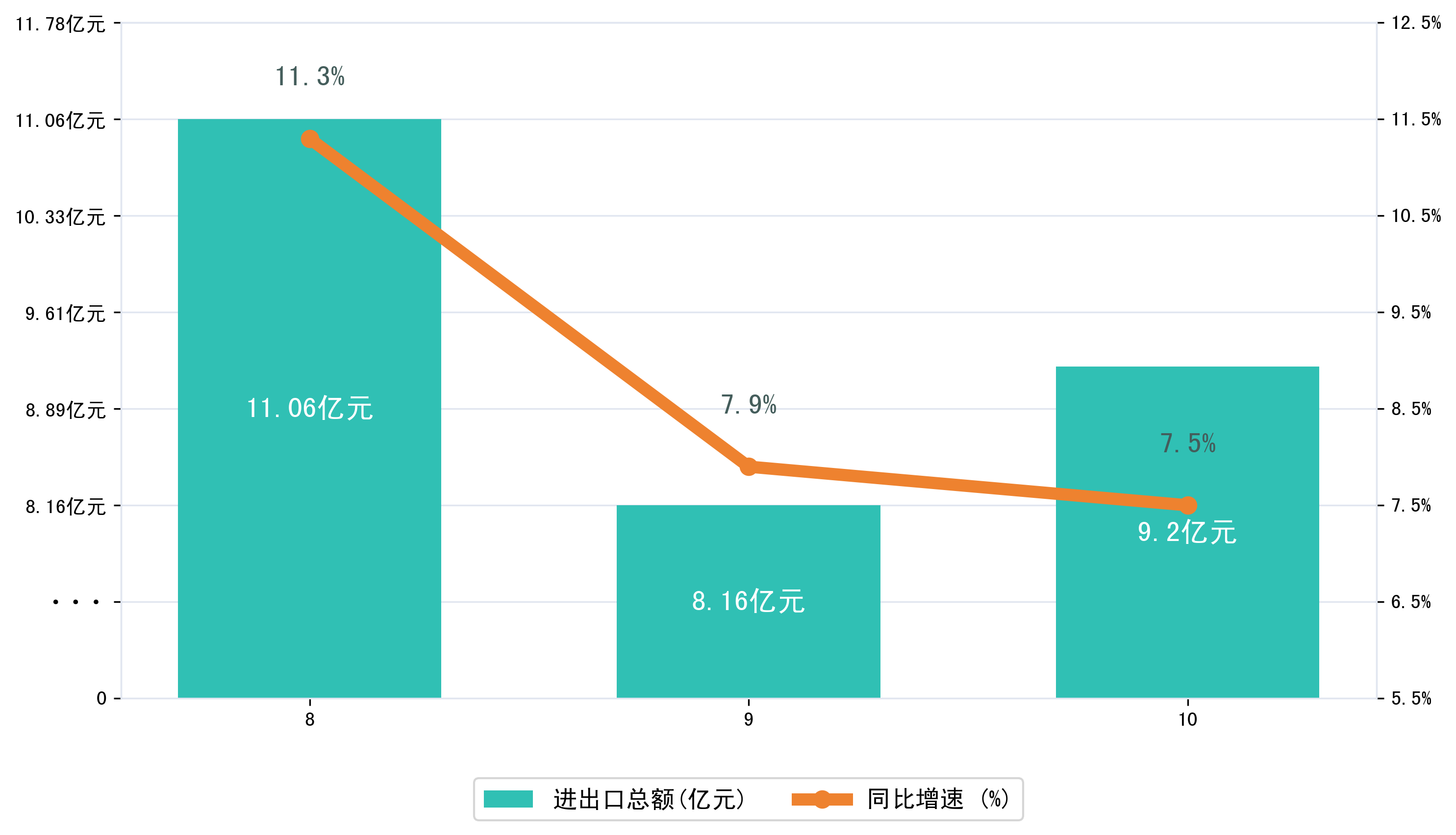 以人民币计,2025年10月桂林市进出口总额为9,2040.0203万元,相比上月增加了1,0414.3393万元;相比上年同期增加了3383.7056万元,同比增加了7.50%。
