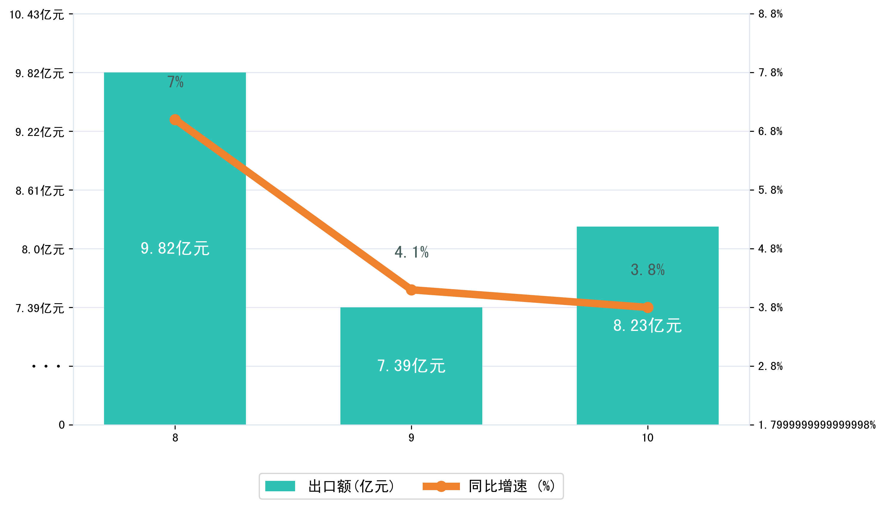 以人民币计,2025年10月桂林市出口额为8,2299.2283万元,相比上月增加了8358.5105万元;相比上年同期增加了948.5099万元,同比增加了3.80%。