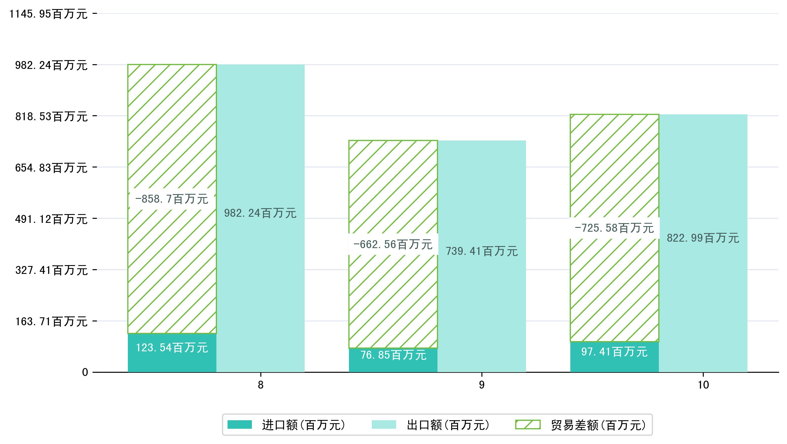 以美元计,2025年10月桂林市贸易差额为1,0205,8655万美元(贸易顺差),相比上月增加了914,2369万美元;相比上年同期减少了247,8554万美元,同比减少-2.37%。