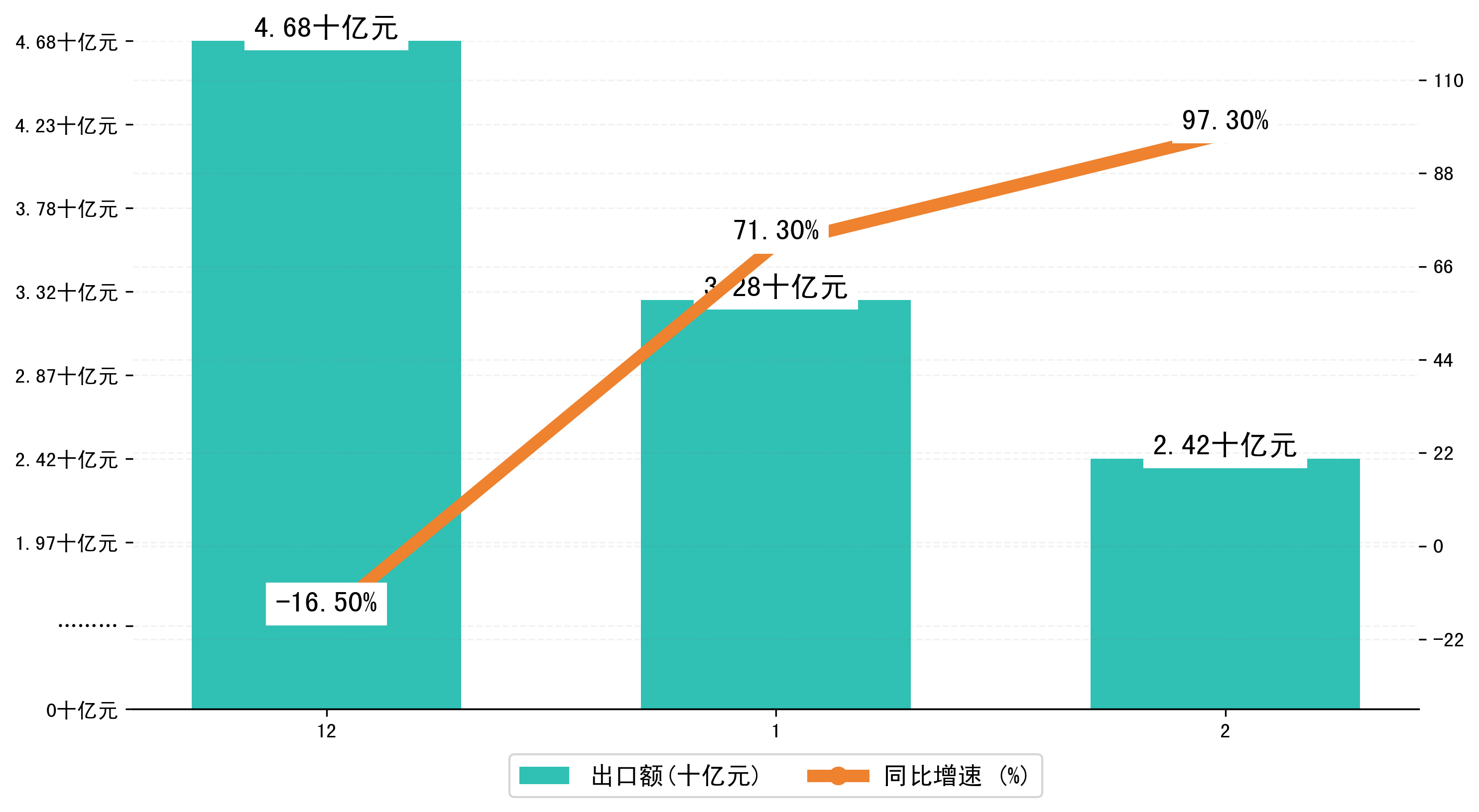 以人民币计,2023年1-2月贵阳市出口额为56,9575.4269万元,相比上年同期增加了28,0824.4913万元,同比增加了97.30%。