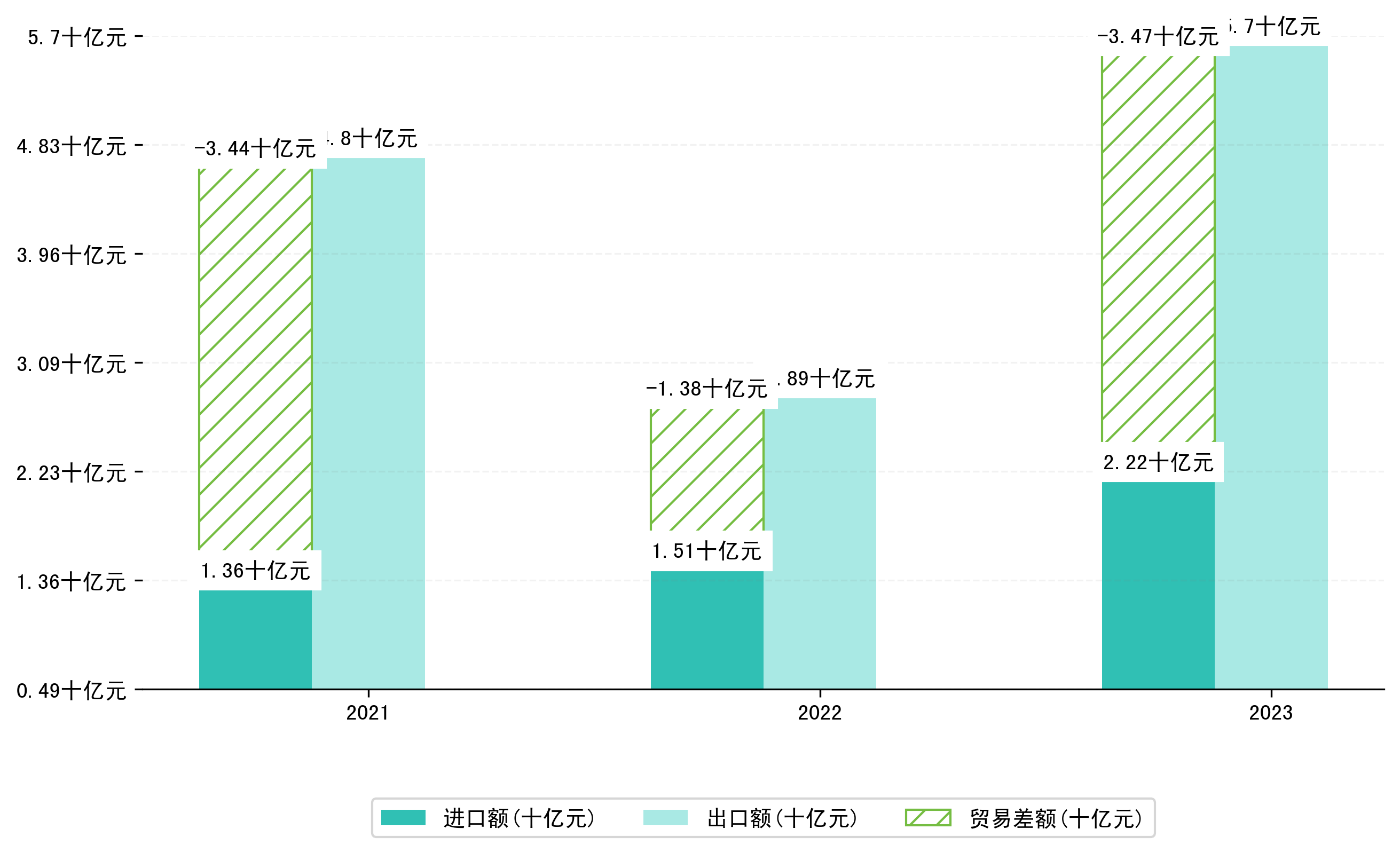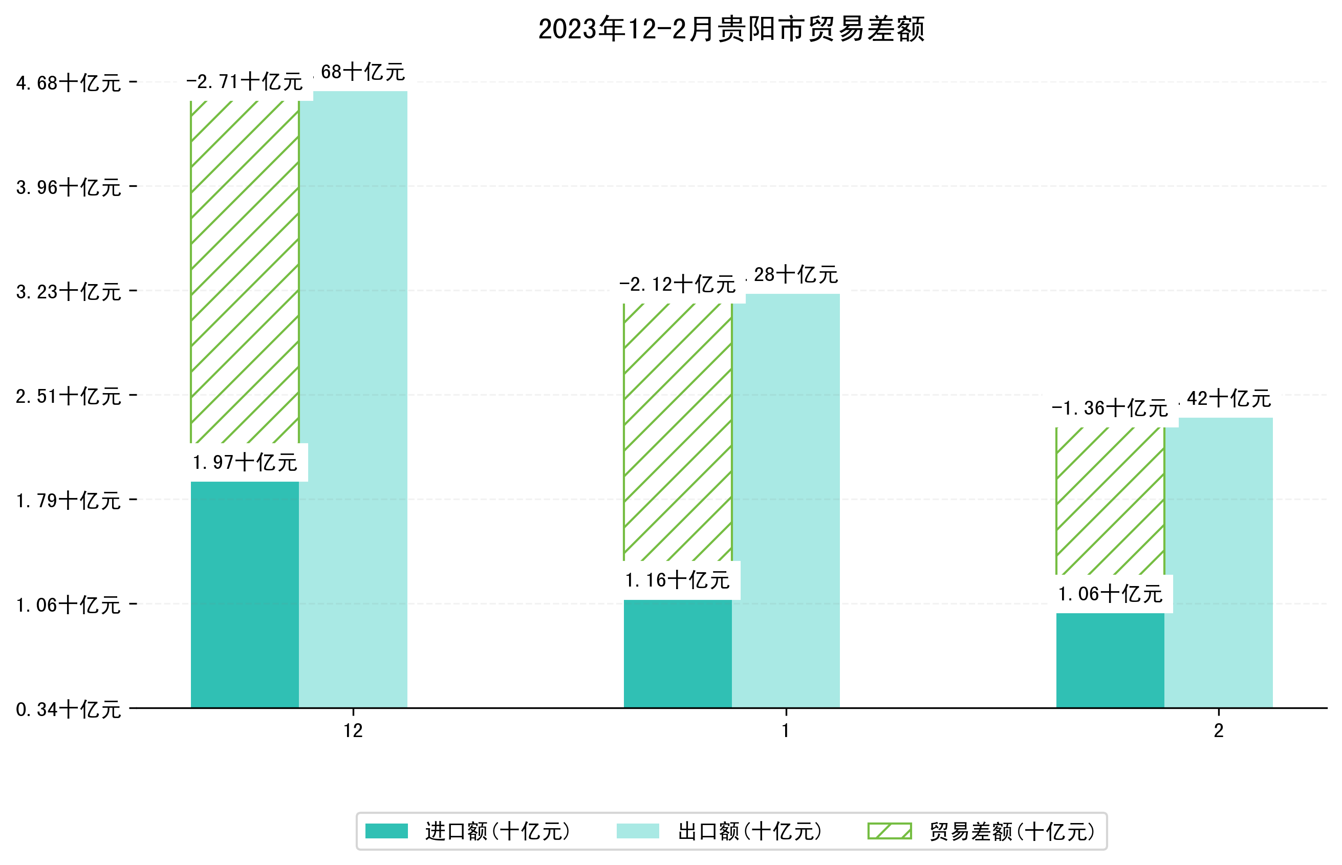 以人民币计,2023年1-2月贵阳市贸易差额为34,7466,6816万元(贸易顺差),相比上年同期增加了20,9919,6437万元,同比增加152.62%。