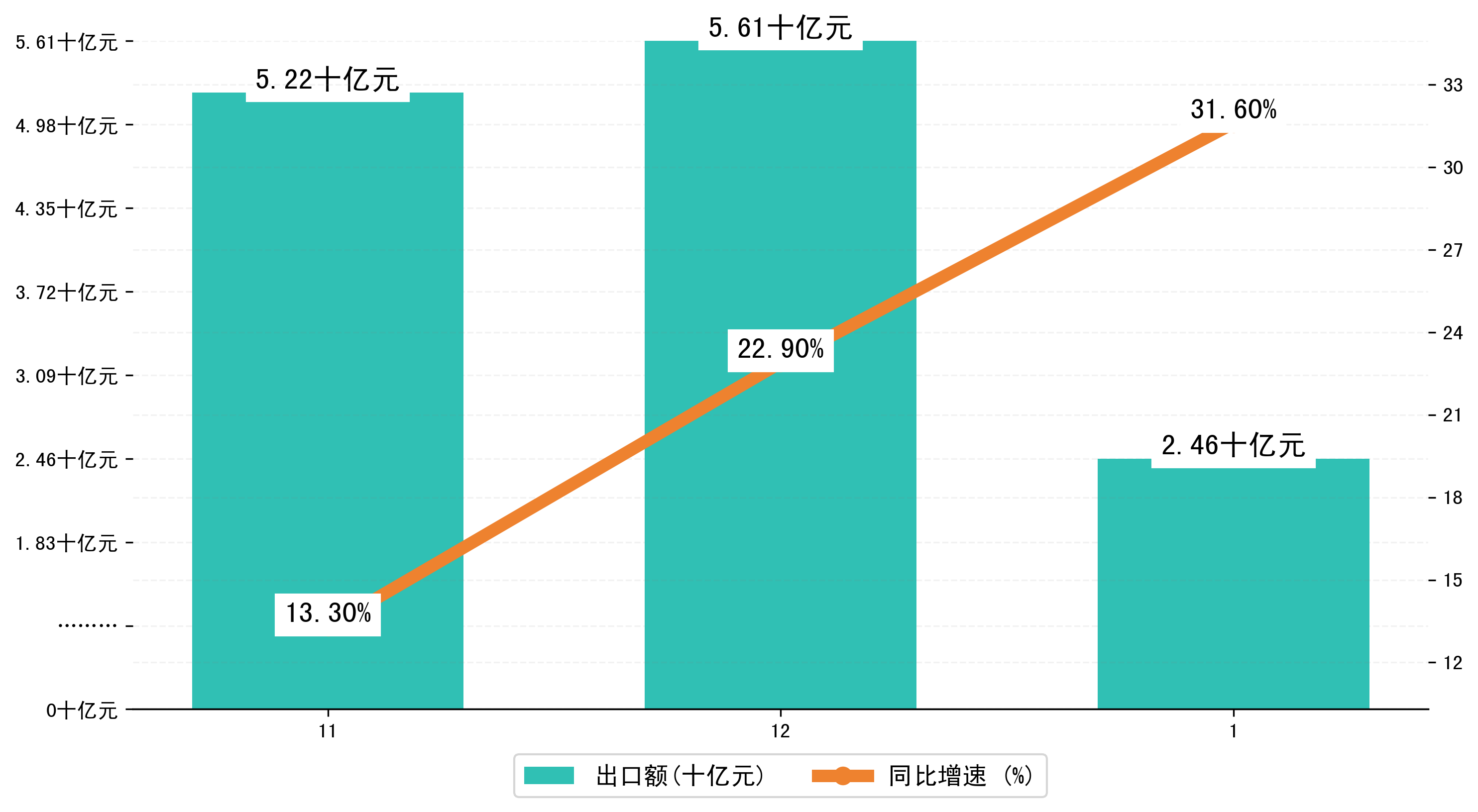 以人民币计,2024年1月贵阳市出口额为24,5894.2067万元,相比上月减少了31,5578.6066万元;相比上年同期减少了8,1793.5095万元,同比增加了31.60%。