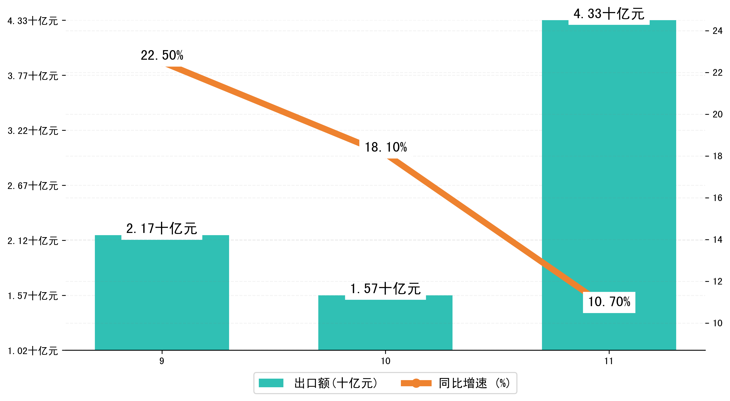 以人民币计,2024年11月贵阳市出口额为43,2528.2344万元,相比上月增加了27,5269.967万元;相比上年同期减少了8,9848.2656万元,同比增加了10.70%。
