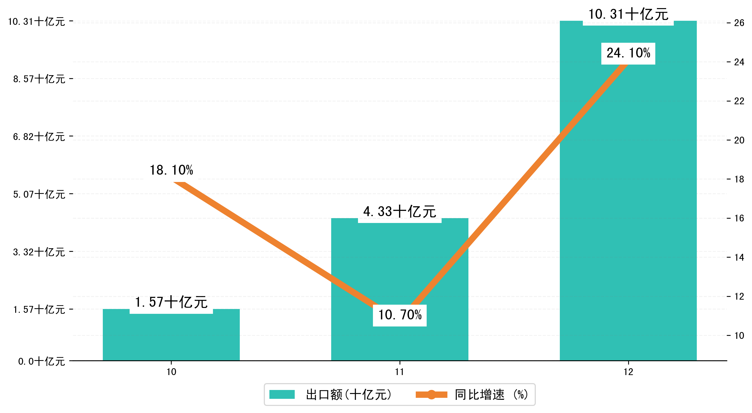 以人民币计,2024年1-12月贵阳市出口额为378,9961.221万元,相比上年同期增加了73,6330.1872万元,同比增加了24.10%。