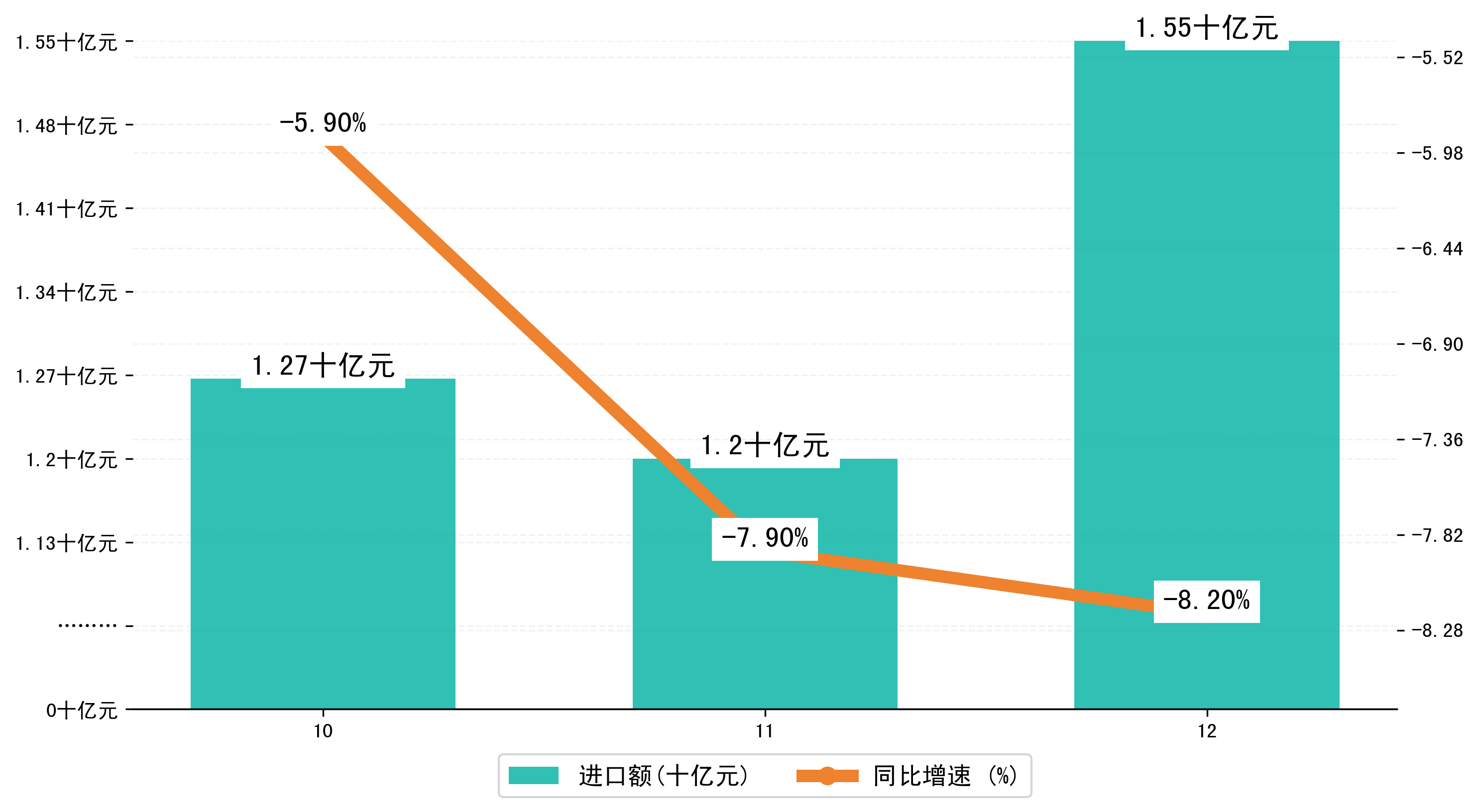 以人民币计,2024年1-12月贵阳市进口额为152,2661.1184万元,相比上年同期减少了14,0640.0781万元,同比减少了-8.20%。
