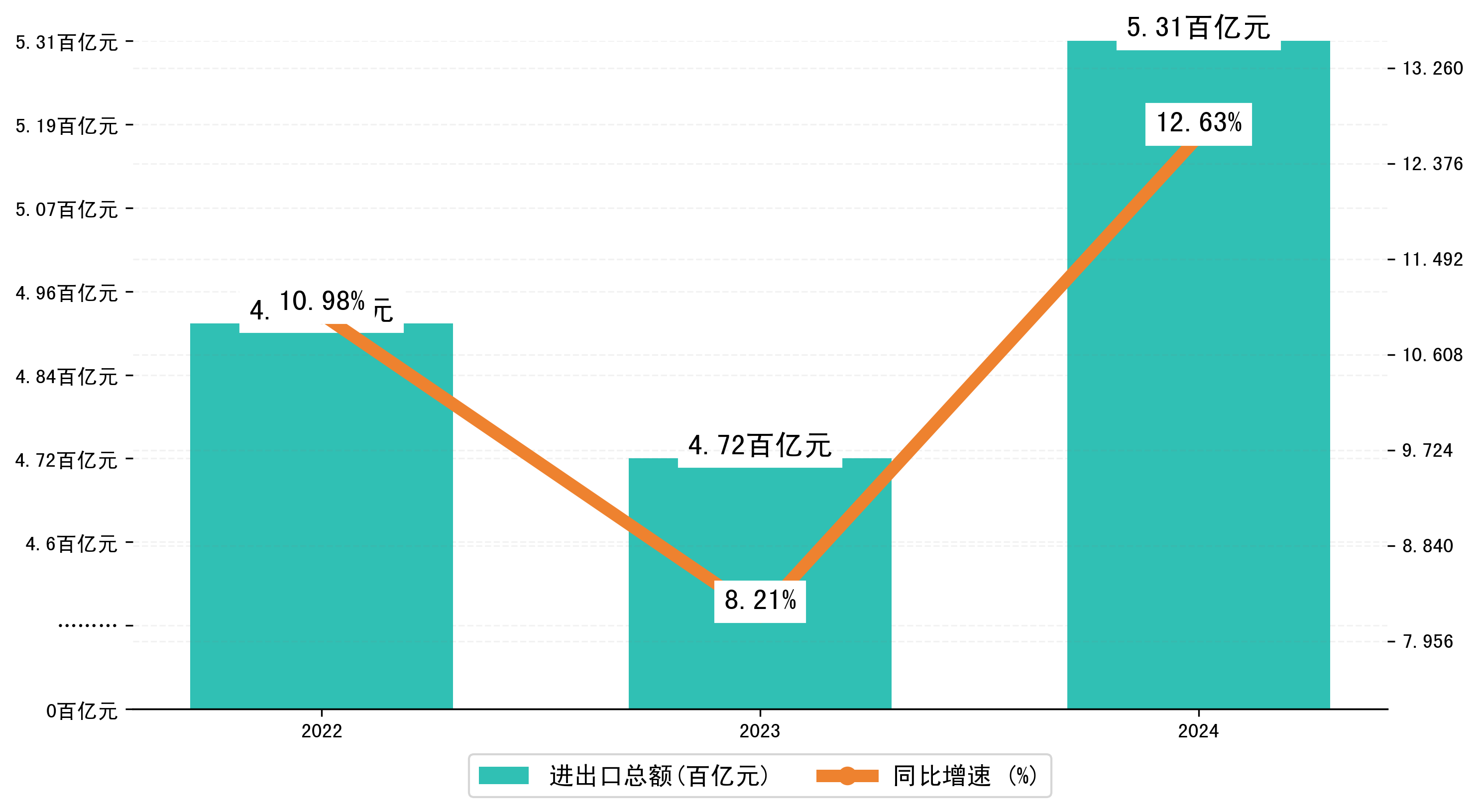 以人民币计,2024年1-12月贵阳市进出口总额为531,2622.3394万元,相比上年同期增加了59,5690.1091万元,同比增加了12.70%。