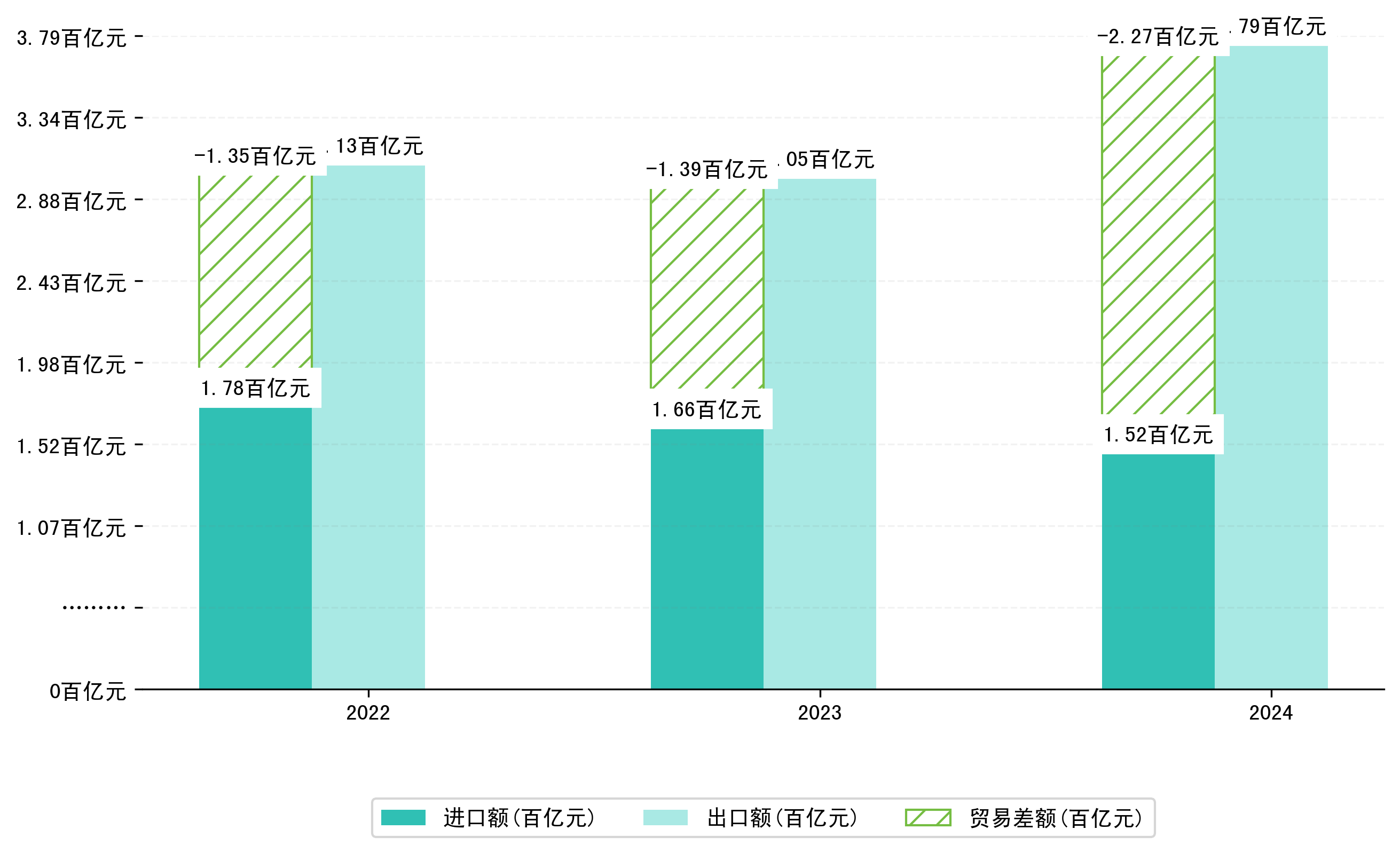 以人民币计,2024年1-12月贵阳市贸易差额为226,7300,1026万元(贸易顺差),相比上年同期增加了87,6970,2653万元,同比增加63.08%。