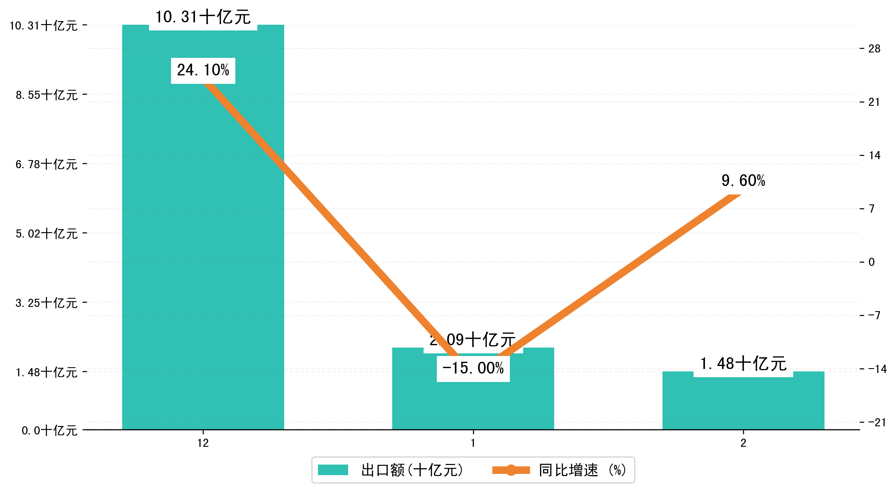 以人民币计,2025年1-2月贵阳市出口额为35,7321.1576万元,相比上年同期增加了3,1342.2147万元,同比增加了9.60%。