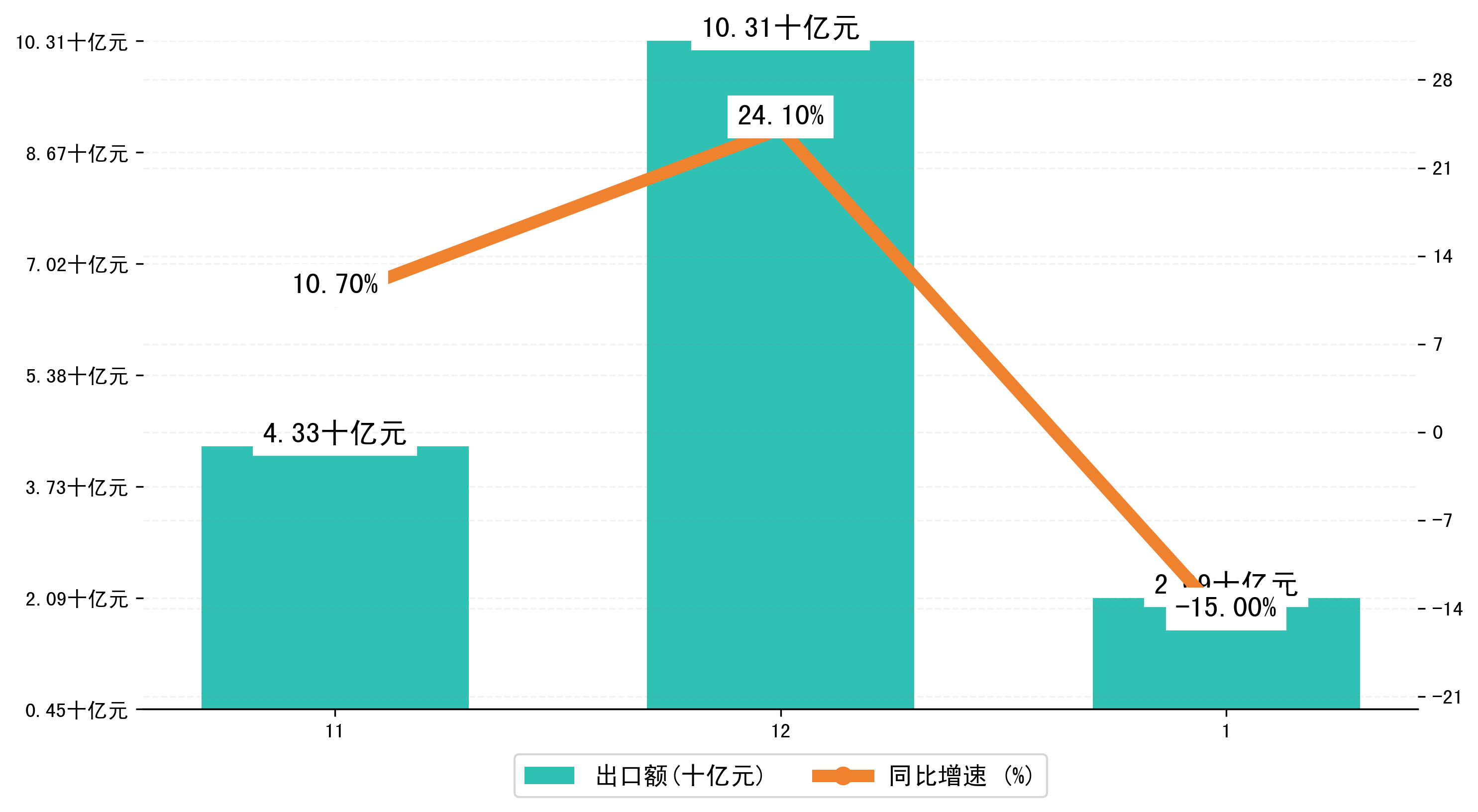 以人民币计,2025年1-1月贵阳市出口额为20,9012.7662万元,相比上年同期减少了3,6881.4405万元,同比减少了-15.00%。