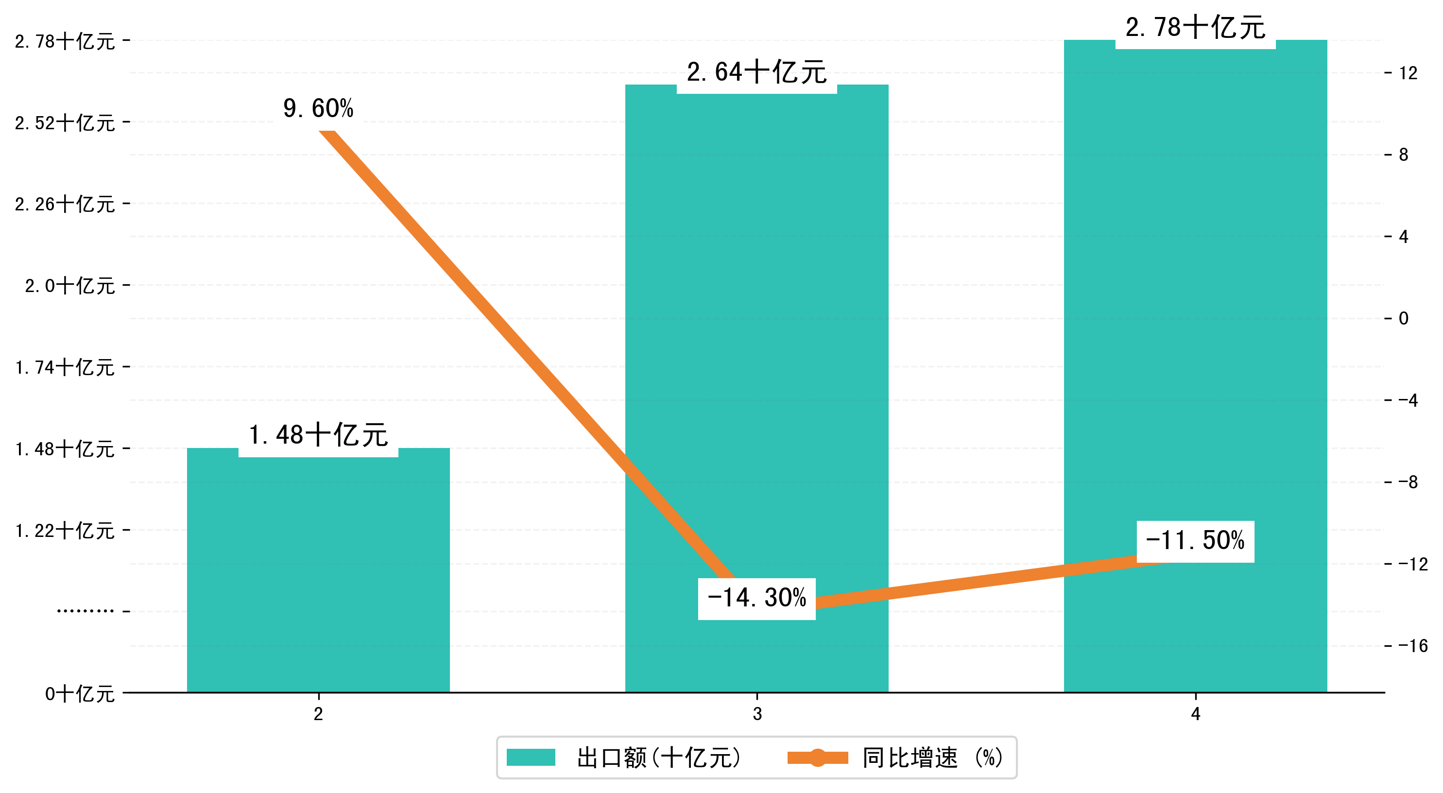 以人民币计,2025年4月贵阳市出口额为27,8356.3891万元,相比上月增加了1,4250.4505万元;相比上年同期减少了1,3160.3853万元,同比减少了-11.50%。
