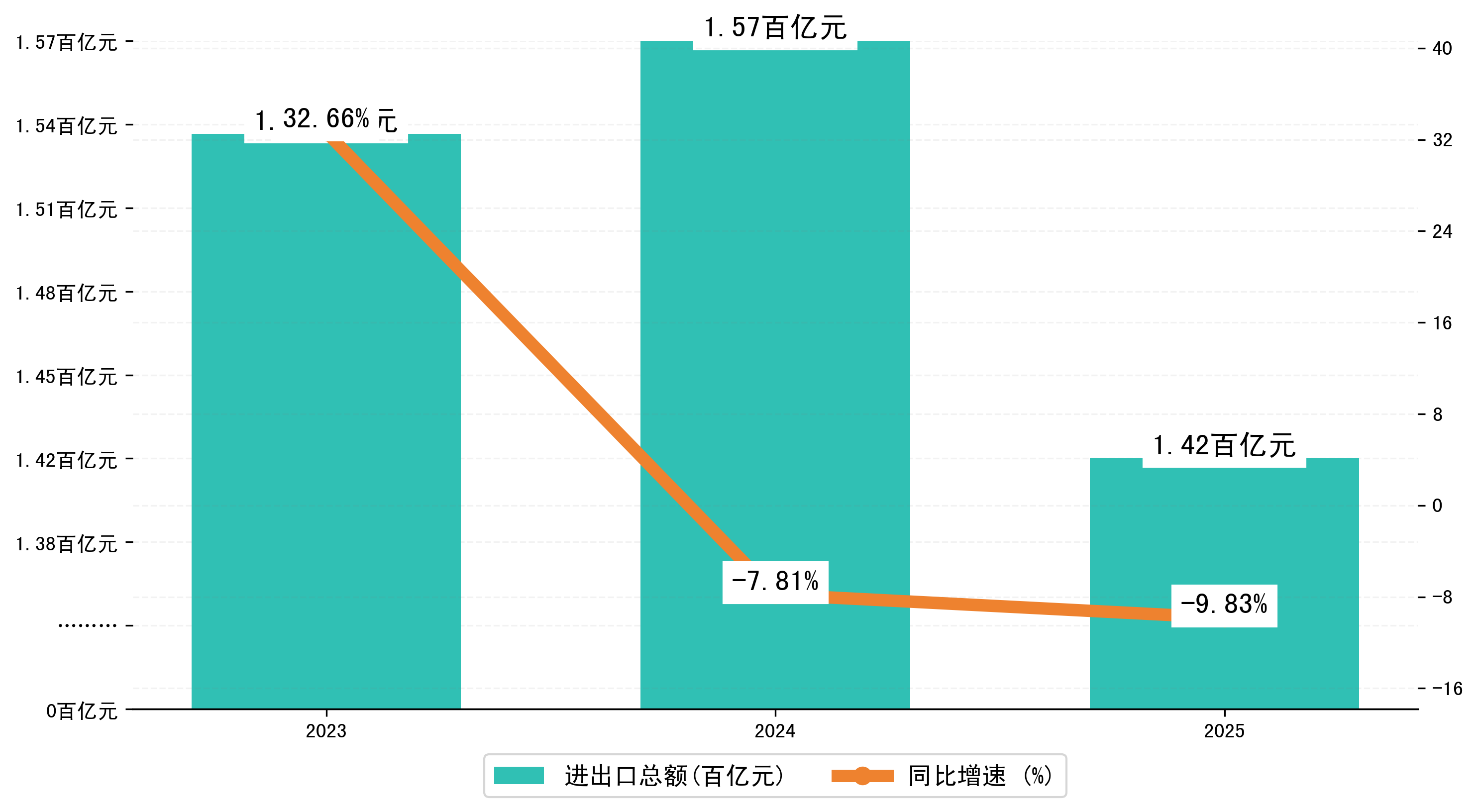 以人民币计,2025年1-4月贵阳市进出口总额为141,5176.6577万元,相比上年同期减少了15,4362.5884万元,同比减少了-9.80%。