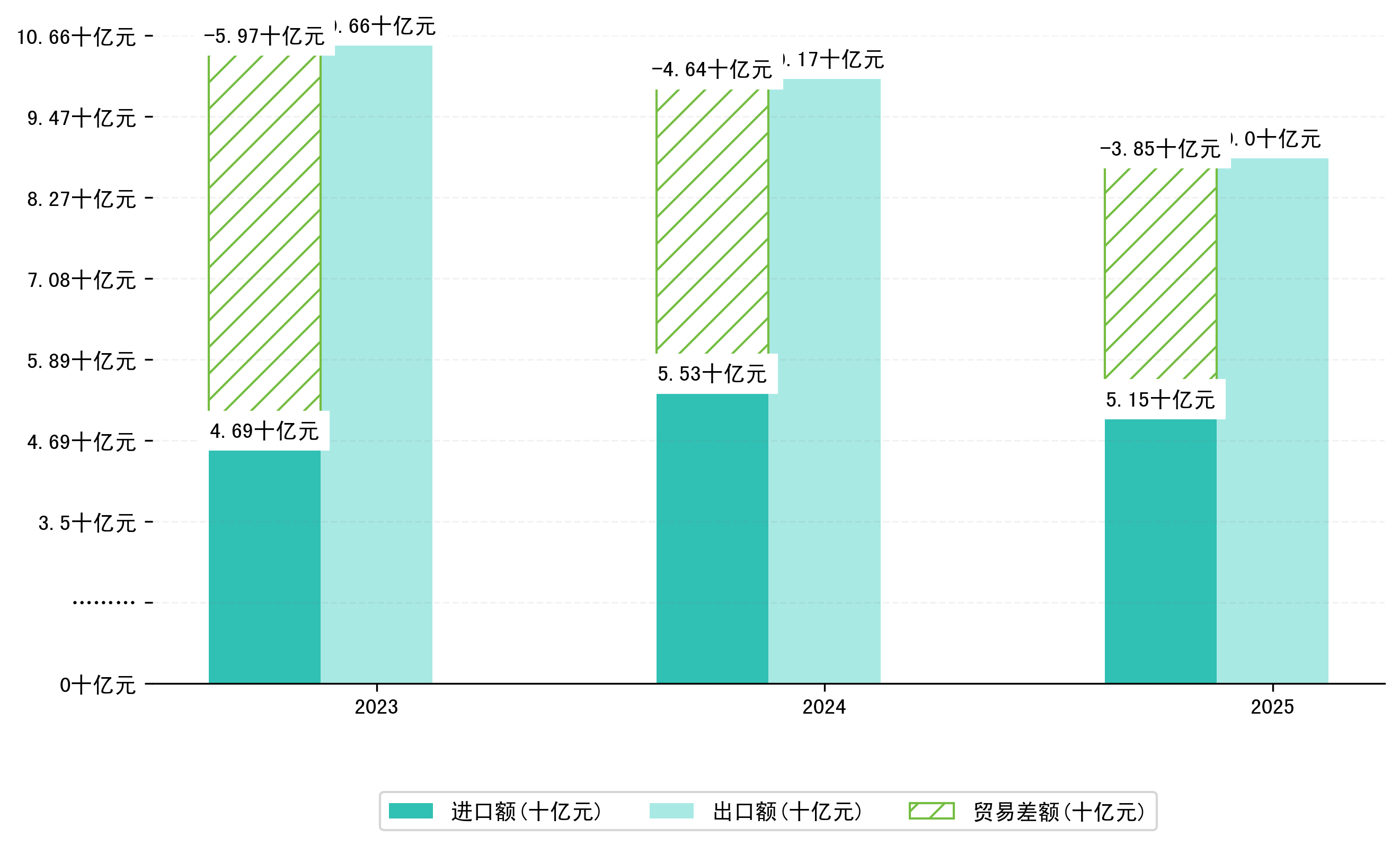 以美元计,2025年1-4月贵阳市贸易差额为5,3593,4941万美元(贸易顺差),相比上年同期减少了1,1488,9641万美元,同比减少-17.65%。