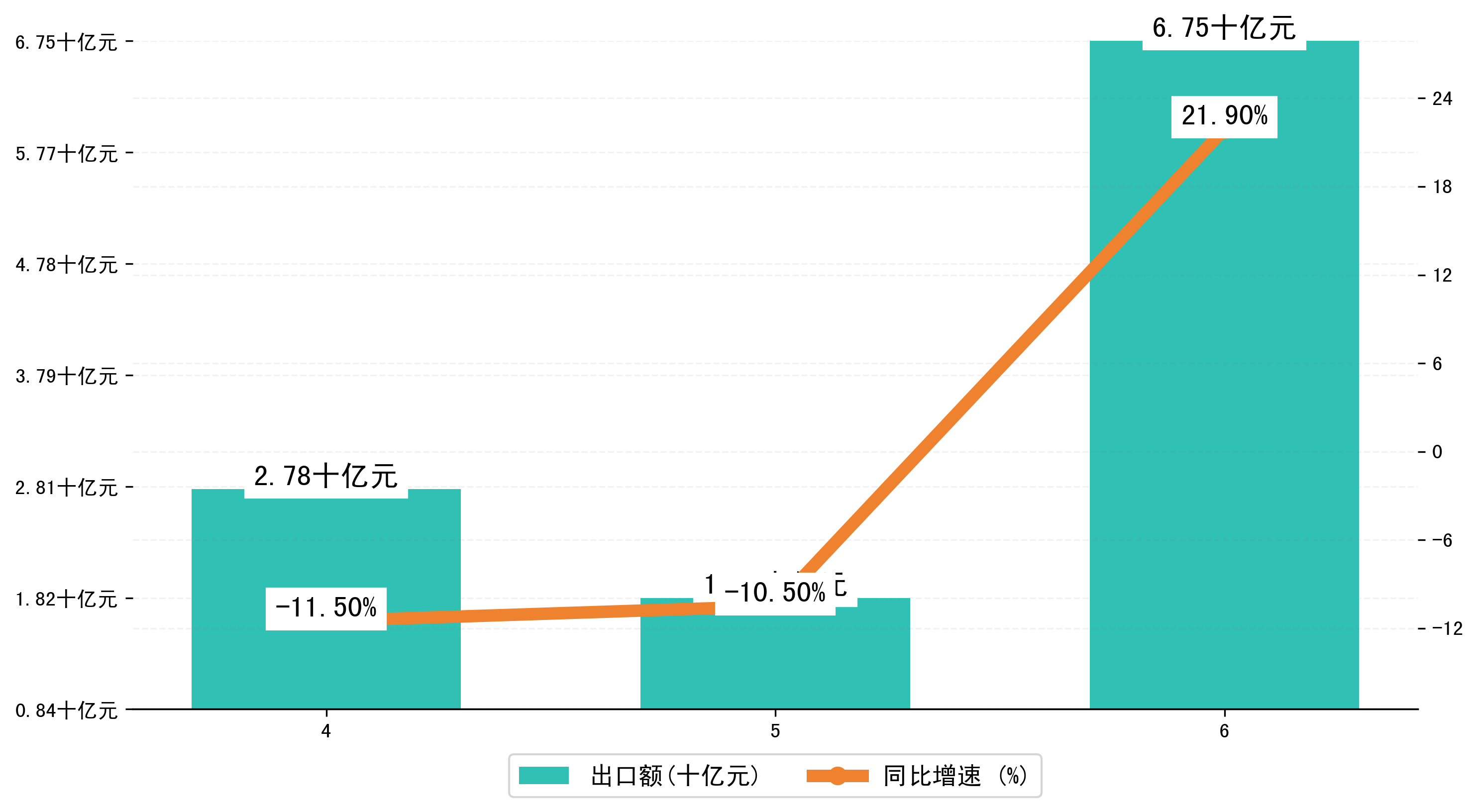 以人民币计,2025年6月贵阳市出口额为67,5126.3284万元,相比上月增加了49,2843.2803万元;相比上年同期增加了44,0753.1785万元,同比增加了21.90%。