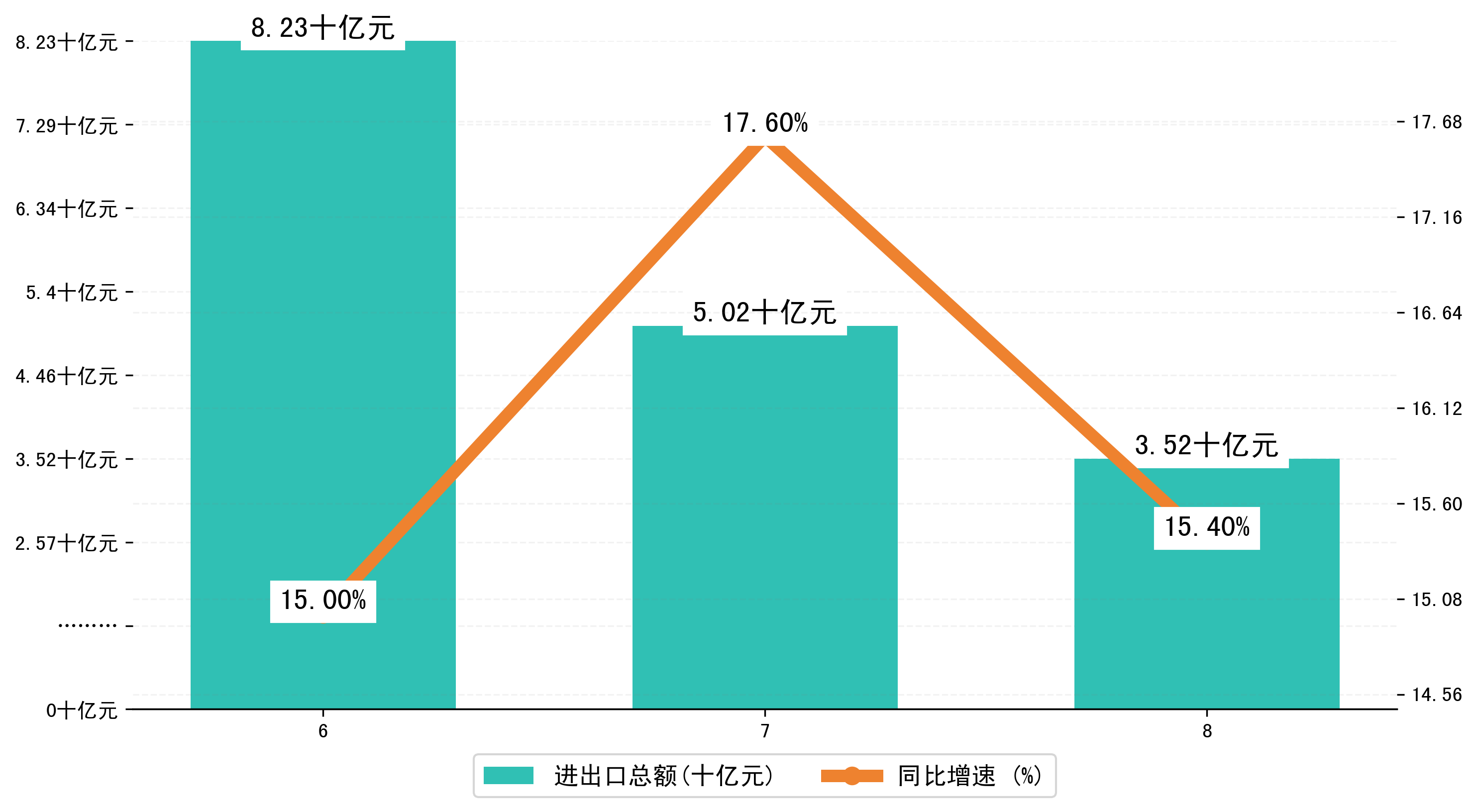 以人民币计,2025年1-8月贵阳市进出口总额为346,4921.5314万元,相比上年同期增加了45,0640.8722万元,同比增加了15.40%。