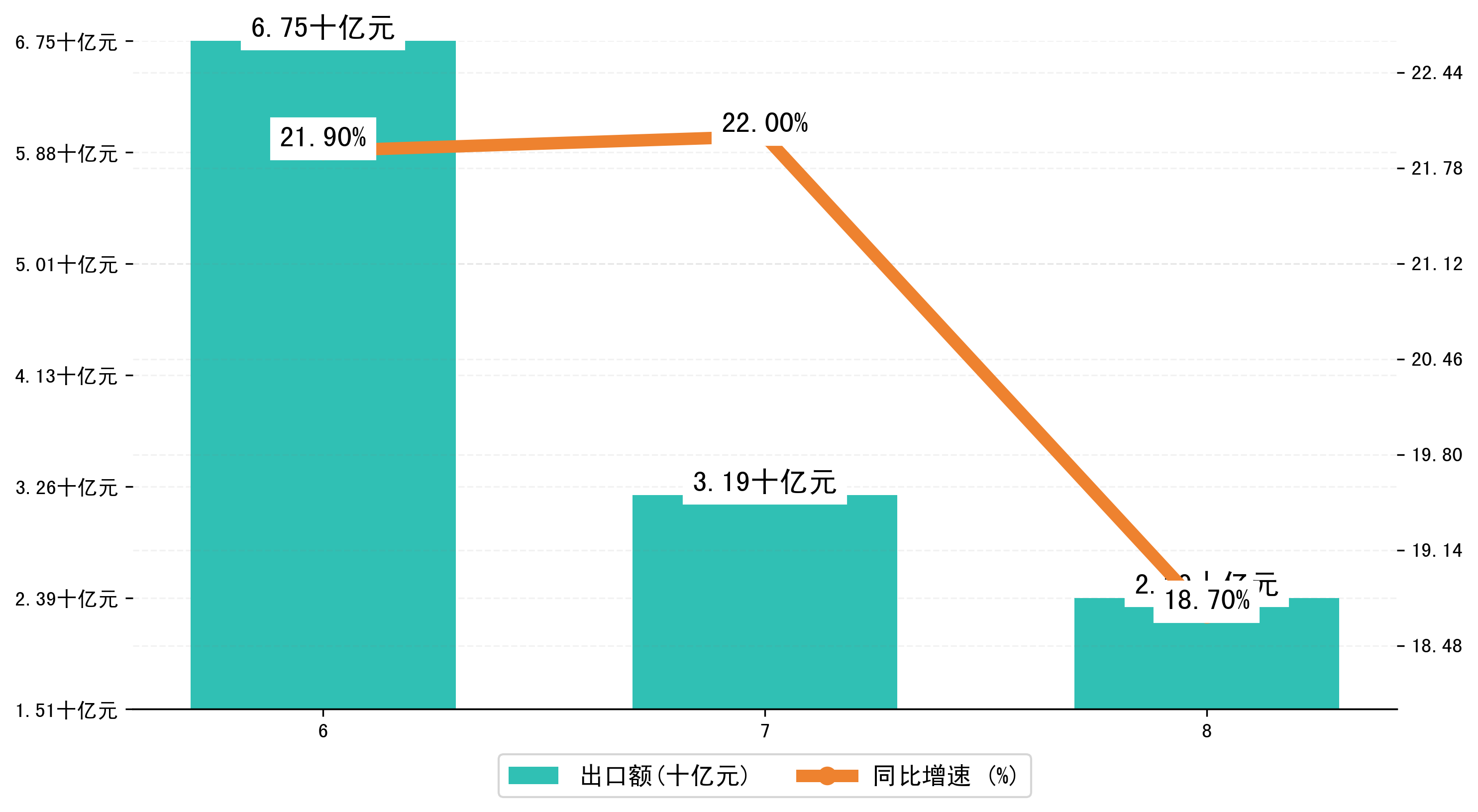 以人民币计,2025年1-8月贵阳市出口额为231,6757.7703万元,相比上年同期增加了36,8452.9166万元,同比增加了18.70%。