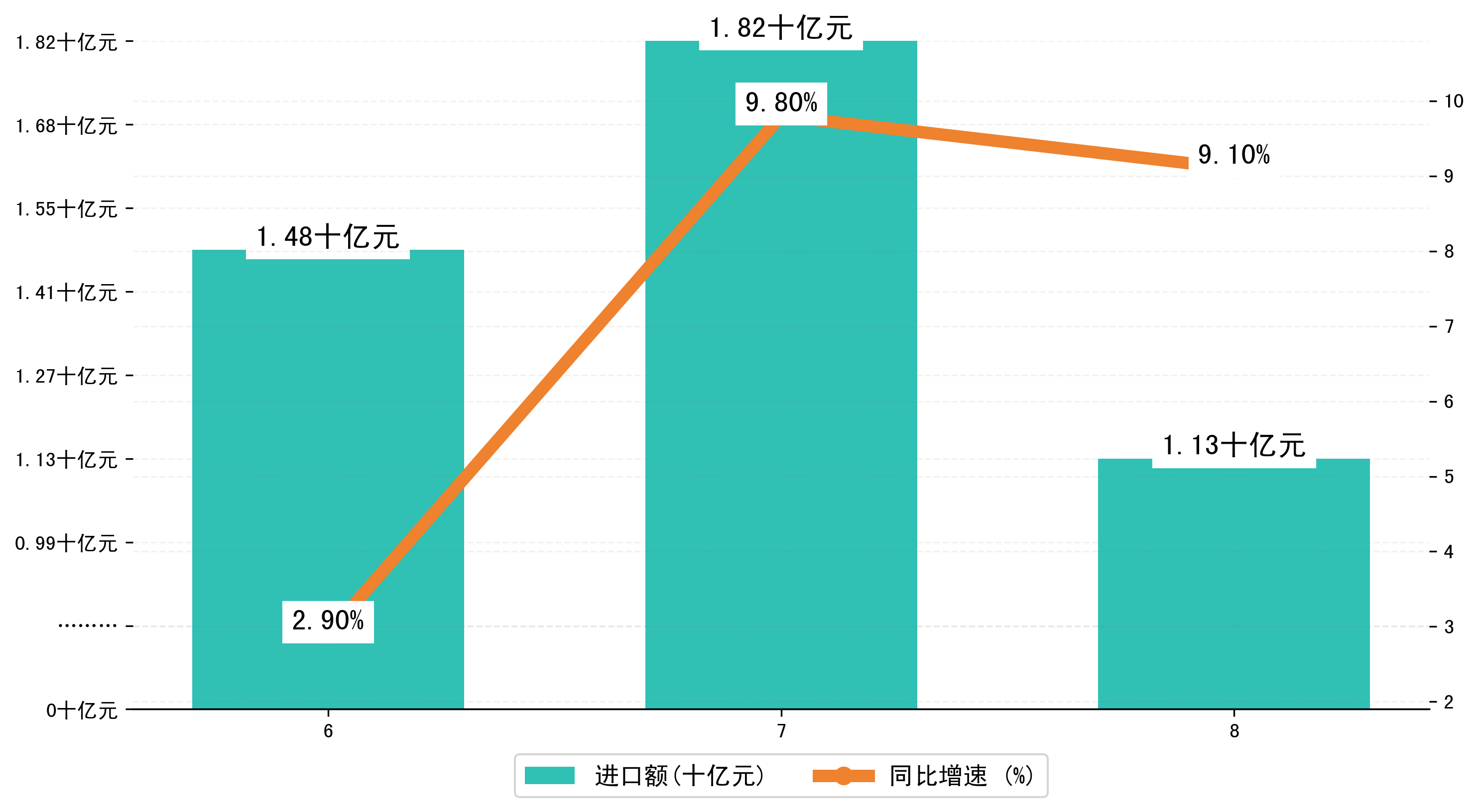 以美元计,2025年1-8月贵阳市进口额为15,9892.4507万美元,相比上年同期增加了9870.6359万美元,同比增加8.00%。