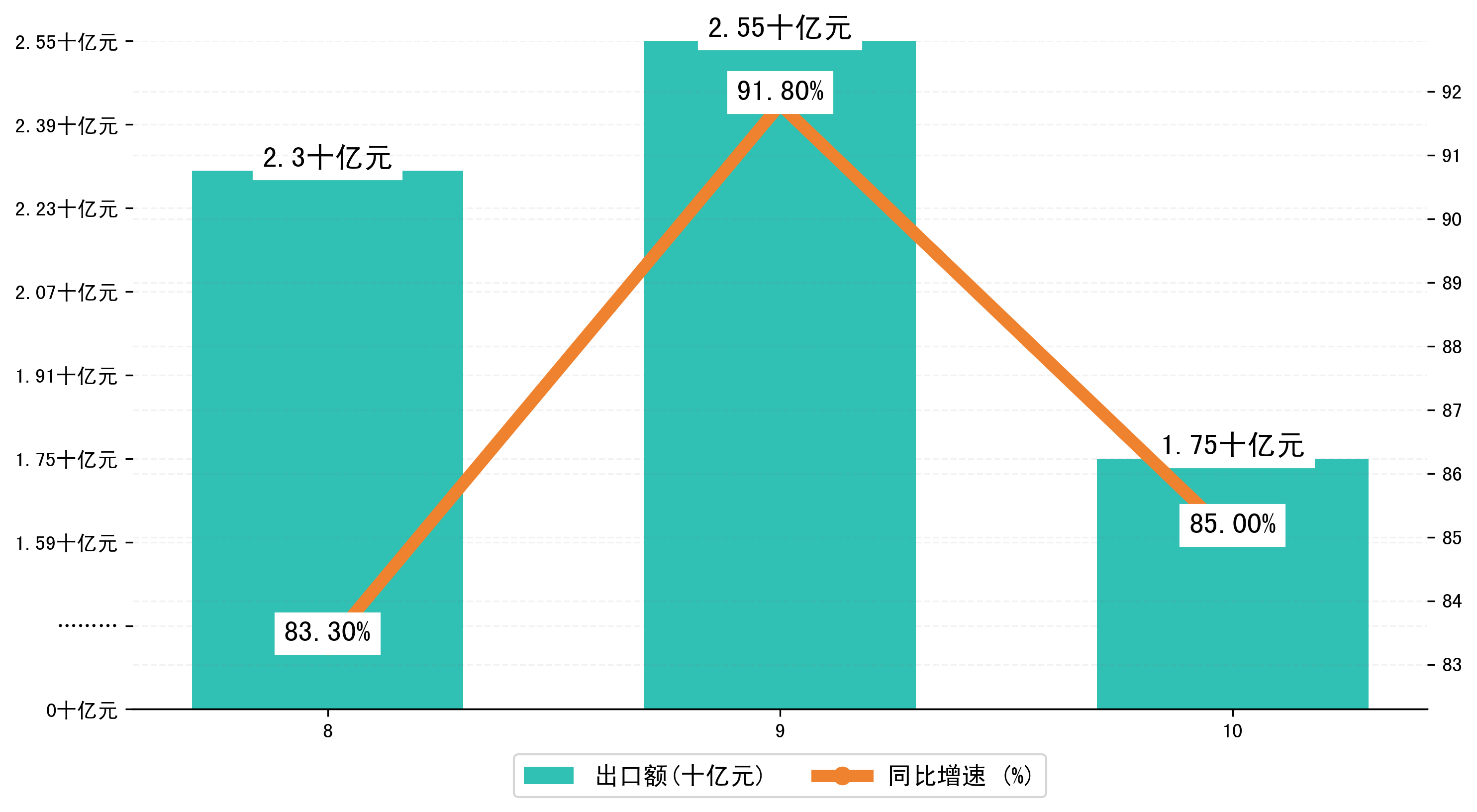 以人民币计,2023年10月哈尔滨市出口额为17,5141.9203万元,相比上月减少了8,0093.3364万元;相比上年同期增加了5,1330.9126万元,同比增加了85.00%。