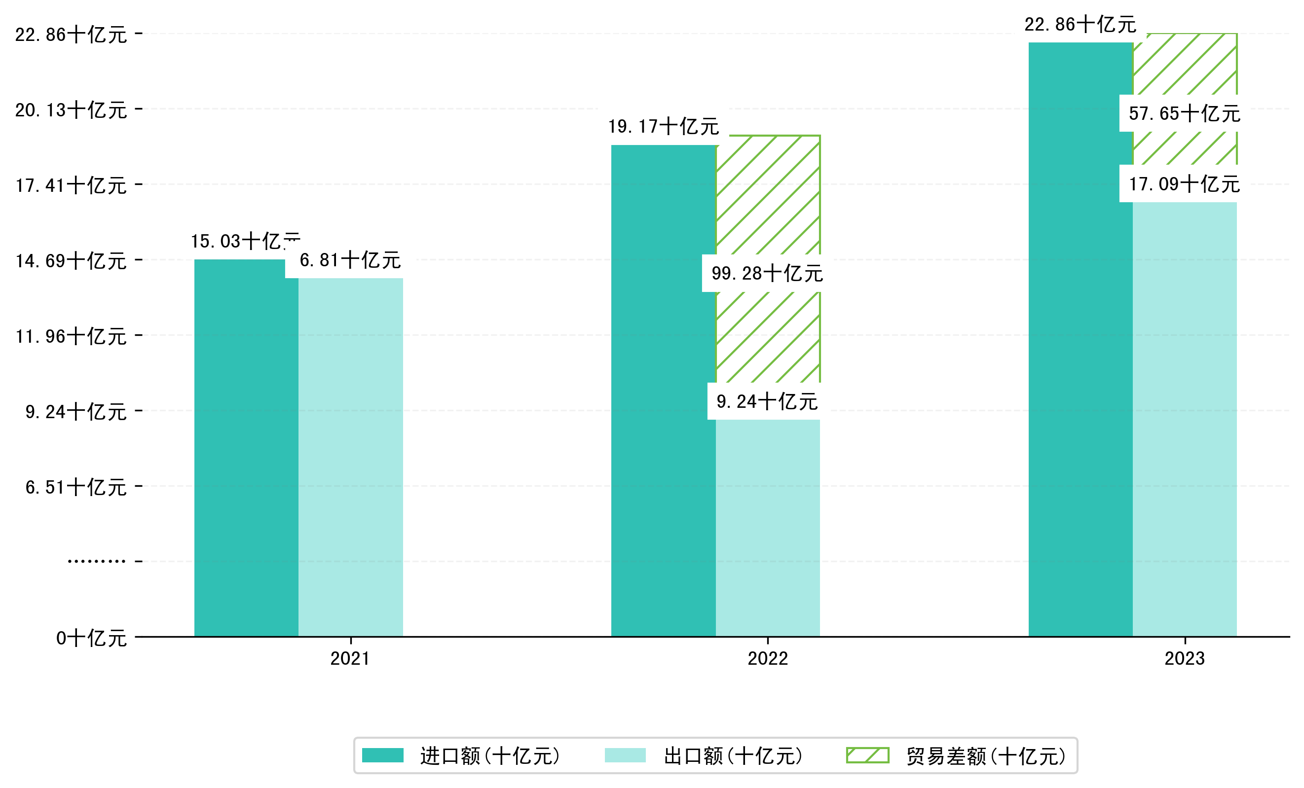 以人民币计,2023年10月哈尔滨市贸易差额为1,1448,2826万元(贸易逆差),相比上月减少了11,3266,3807万元,即1,5695,3723万美元;相比上年同期增加了3,8575,3465万元,同比增加-77.11%。