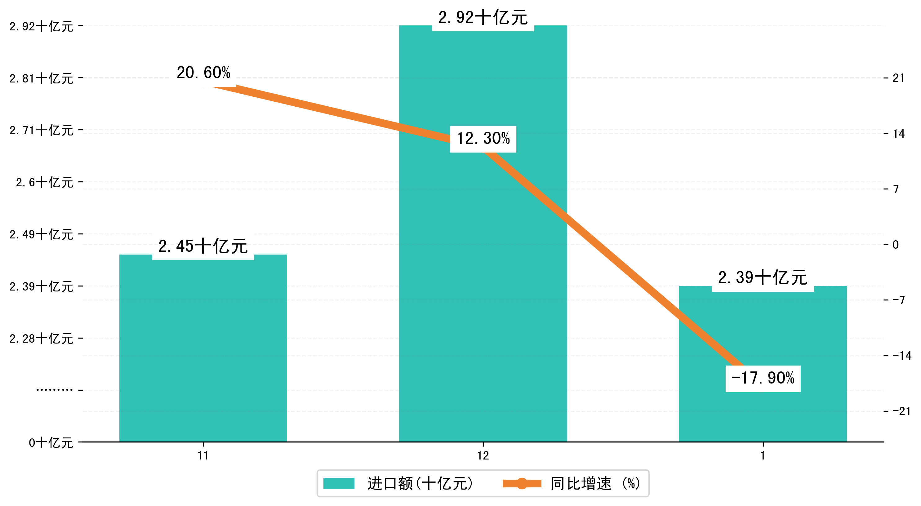 以人民币计,2024年1-1月哈尔滨市进口额为23,8539.4717万元,相比上年同期减少了4,3596.563万元,同比减少了-17.90%。