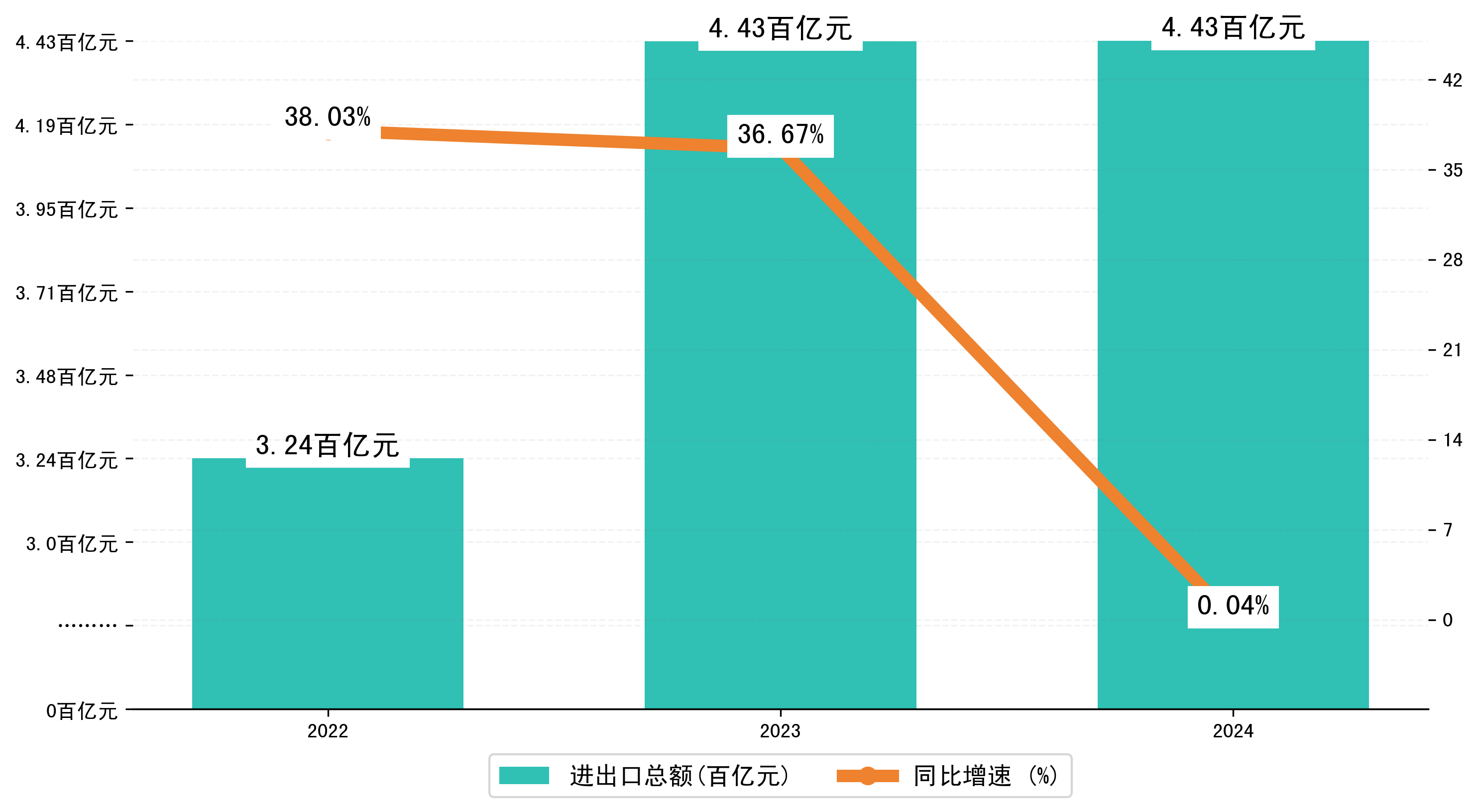 以人民币计,2024年1-11月哈尔滨市进出口总额为442,7548.9753万元,相比上年同期增加了1934.6021万元,同比减少了-0.20%。