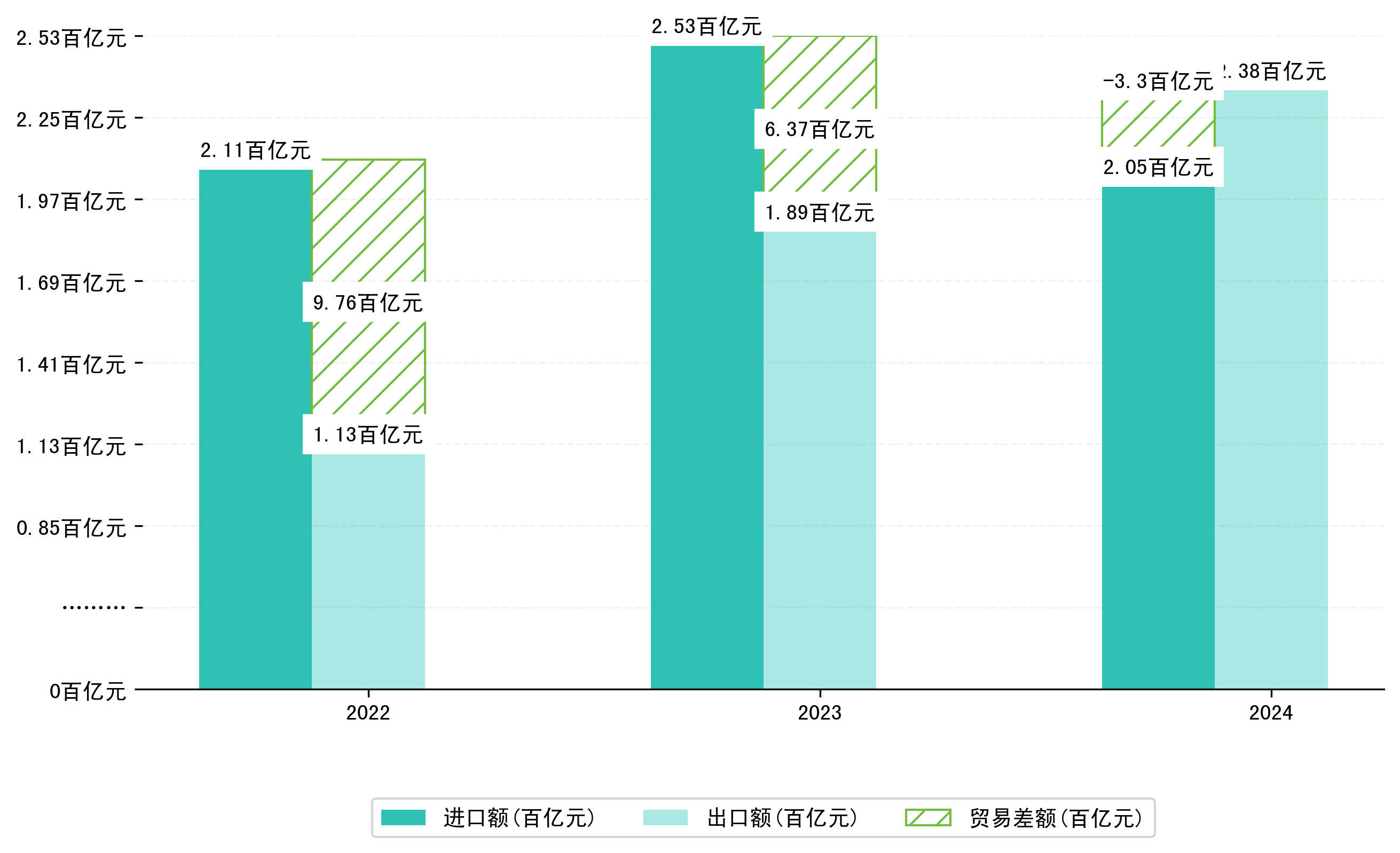 以人民币计,2024年1-11月哈尔滨市贸易差额为33,0340,2795万元(贸易顺差),相比上年同期增加了96,7378,5375万元,同比增加-151.86%。