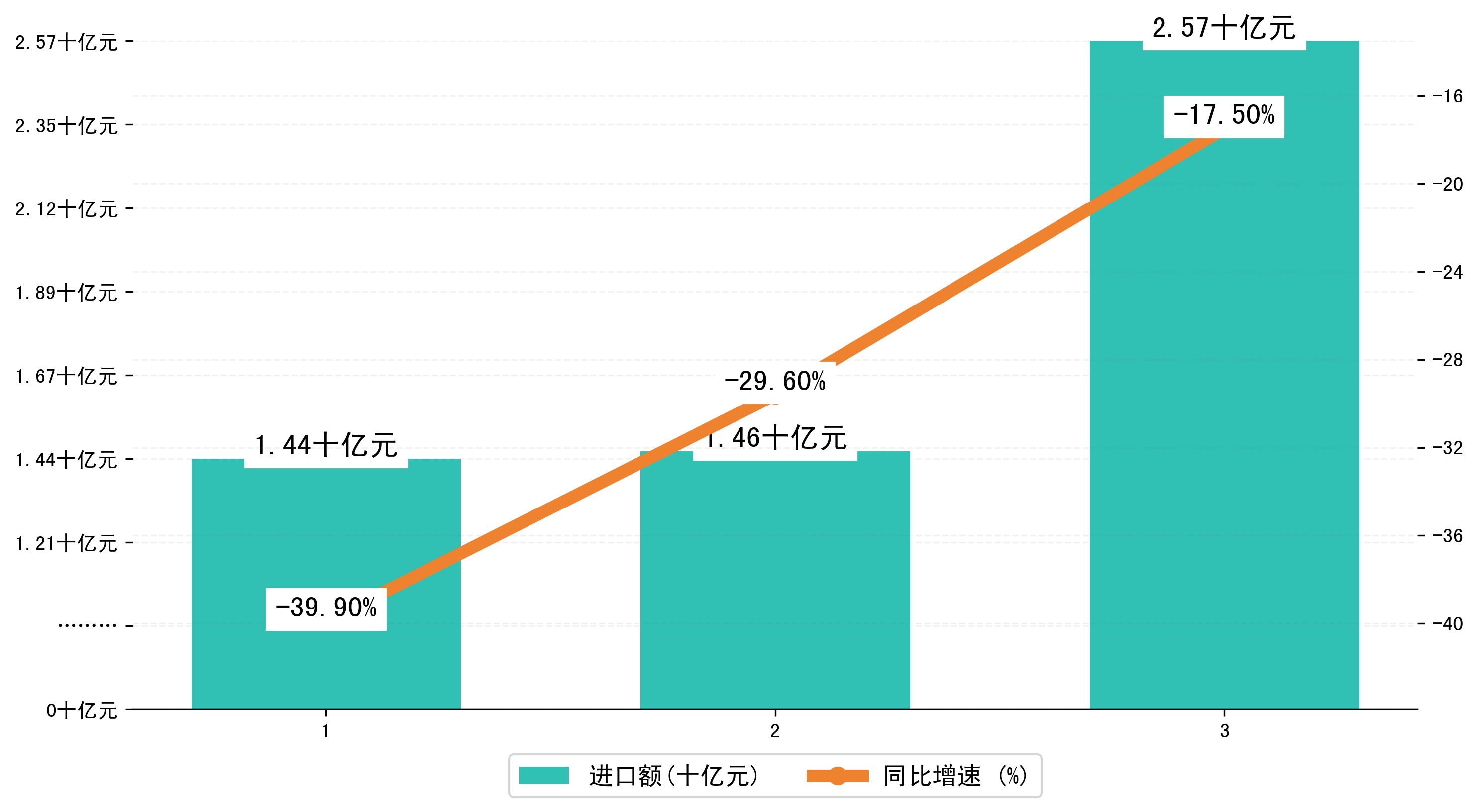 以人民币计,2025年1-3月哈尔滨市进口额为54,7613.371万元,相比上年同期减少了12,4996.3906万元,同比减少了-17.50%。