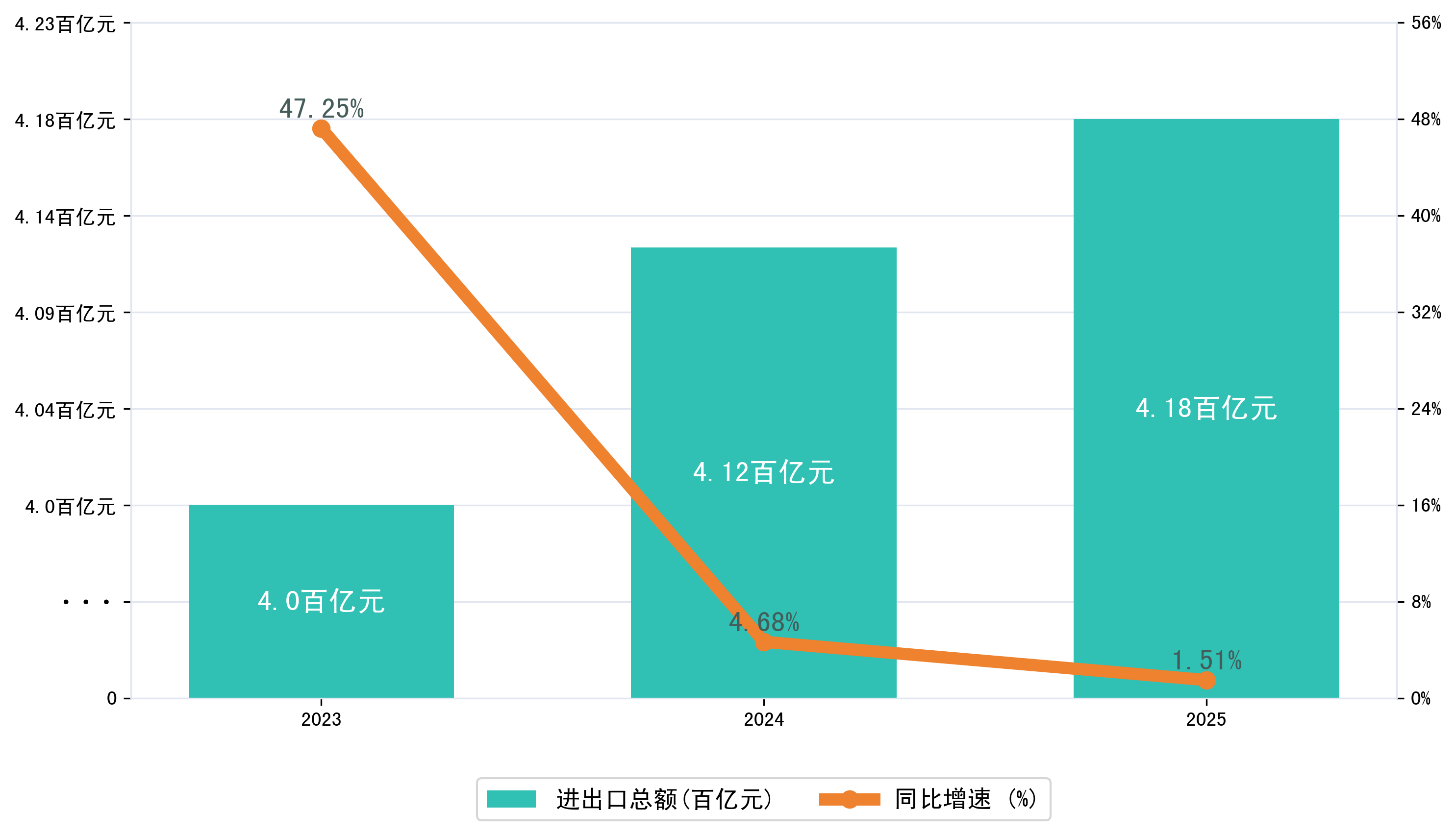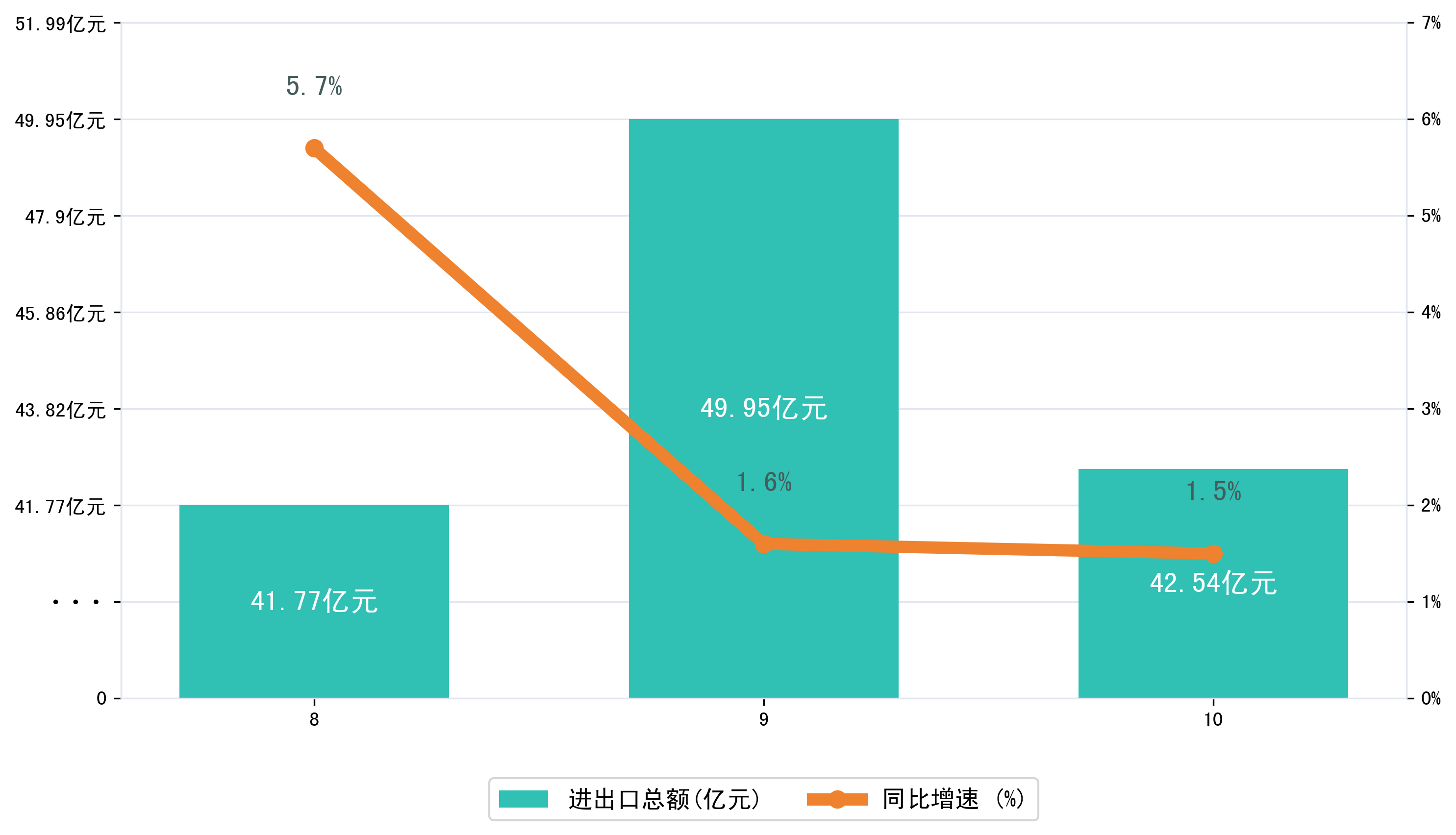以人民币计,2025年1-10月哈尔滨市进出口总额为418,2328.7761万元,相比上年同期增加了6,2124.8505万元,同比增加了1.50%。