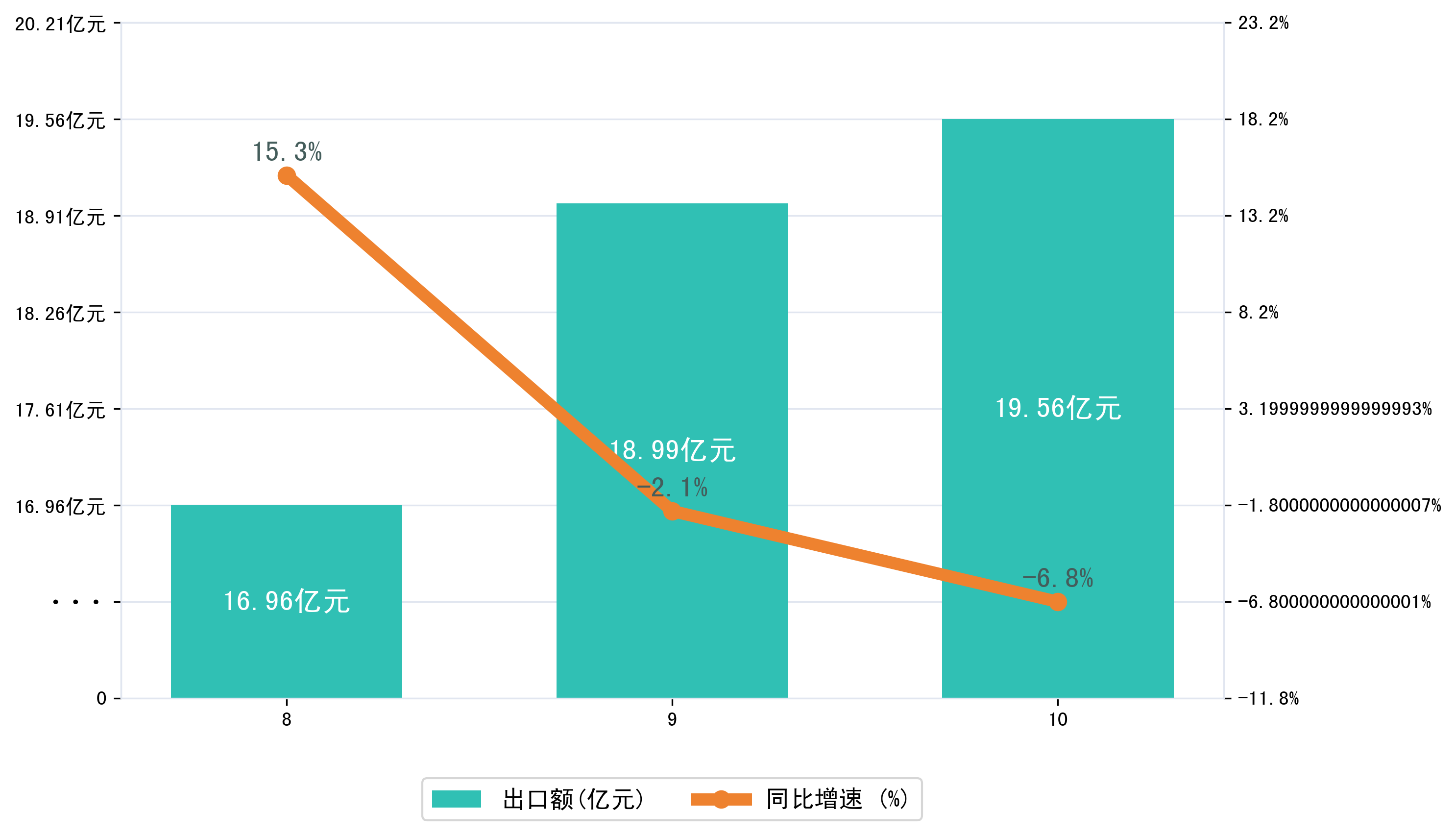以人民币计,2025年10月哈尔滨市出口额为19,5588.0521万元,相比上月增加了5643.5039万元;相比上年同期减少了10,9368.3916万元,同比减少了-6.80%。