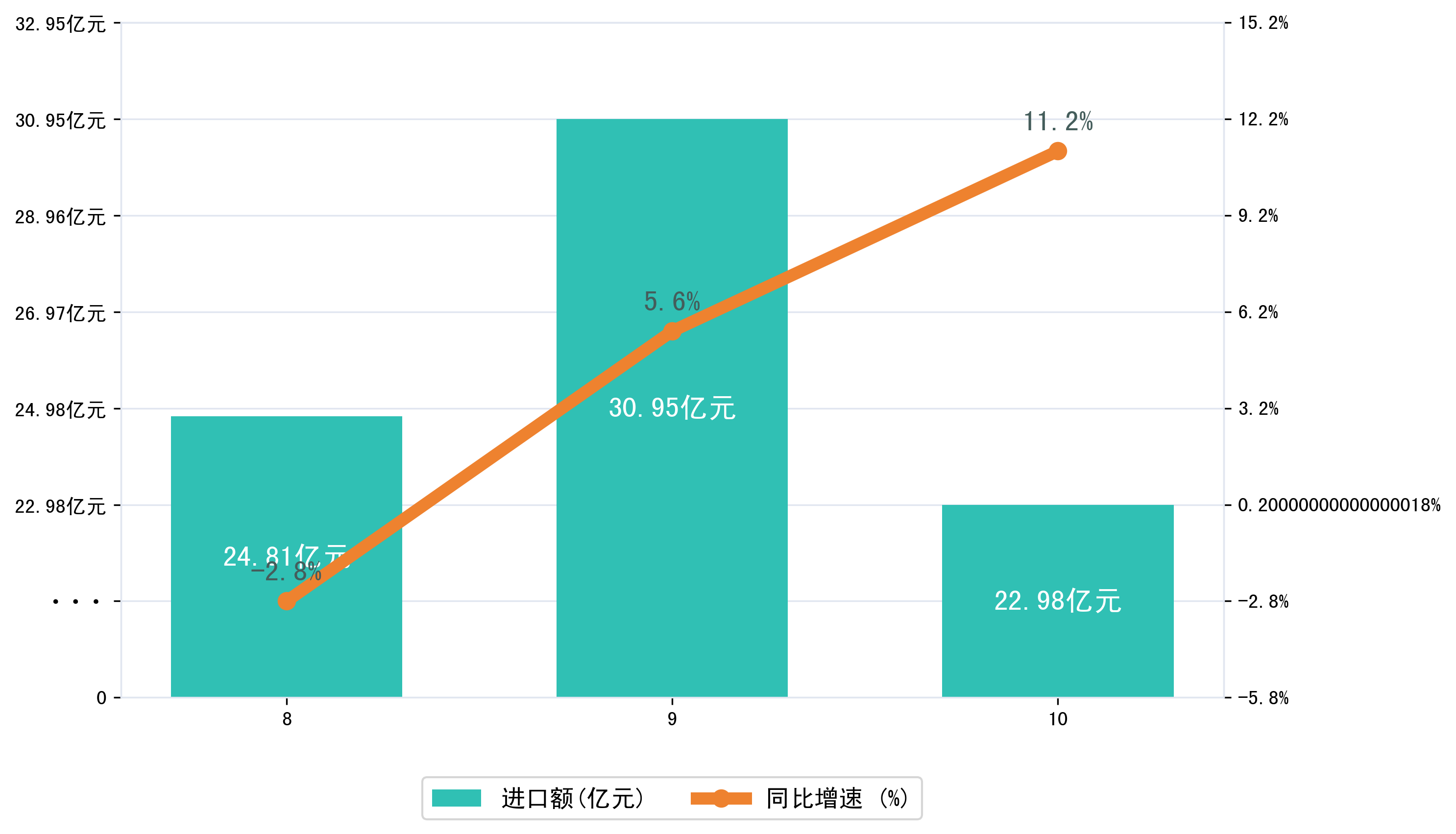 以人民币计,2025年10月哈尔滨市进口额为22,9835.6848万元,相比上月减少了7,9692.5068万元;相比上年同期增加了11,1781.5717万元,同比增加了11.20%。
