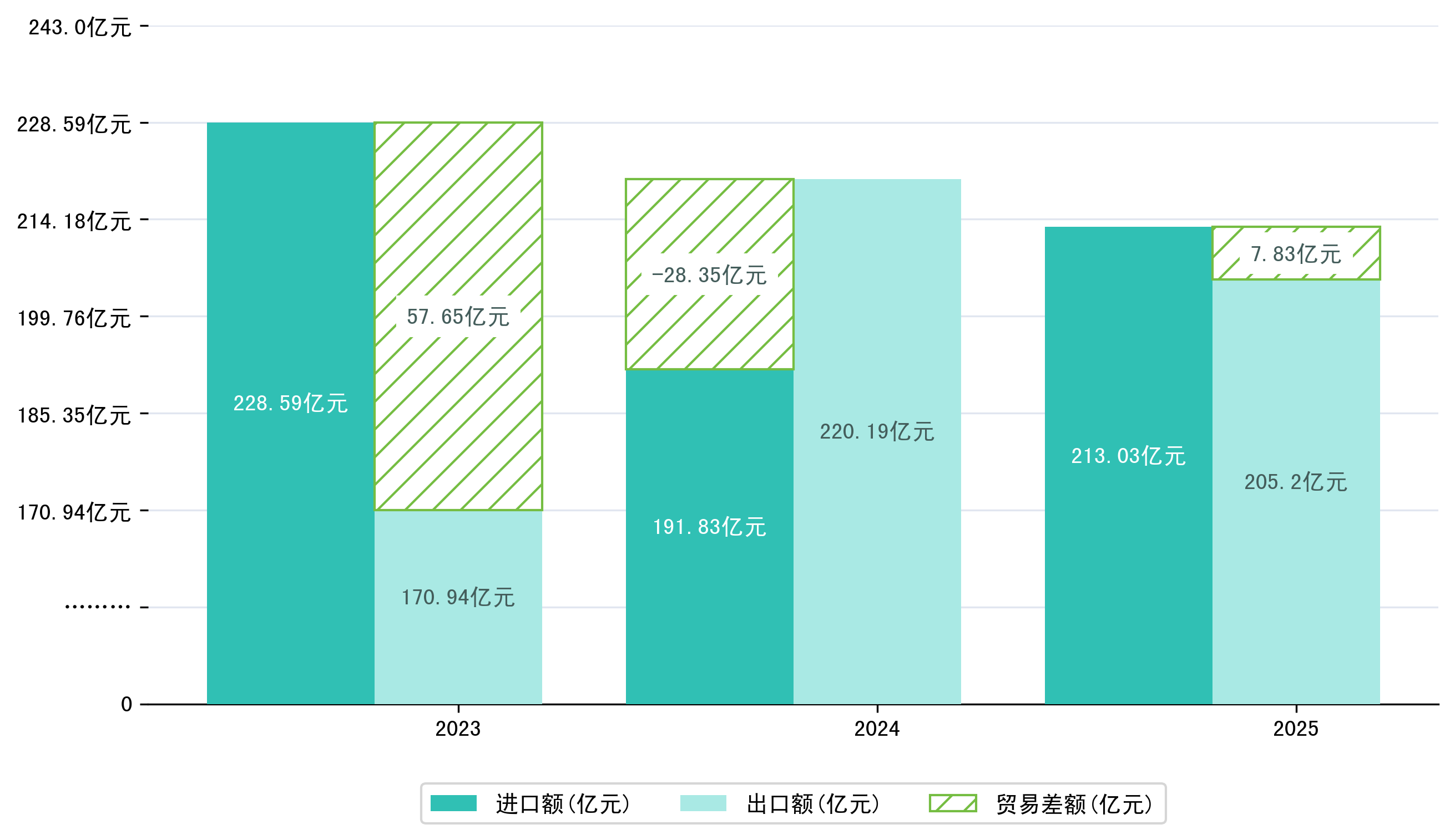 以人民币计,2025年10月哈尔滨市贸易差额为3,4247,6327万元(贸易逆差),相比上月增加了8,5336,0107万元,即1,1920,2300万美元;相比上年同期减少了22,1149,9633万元,同比减少-118.32%。