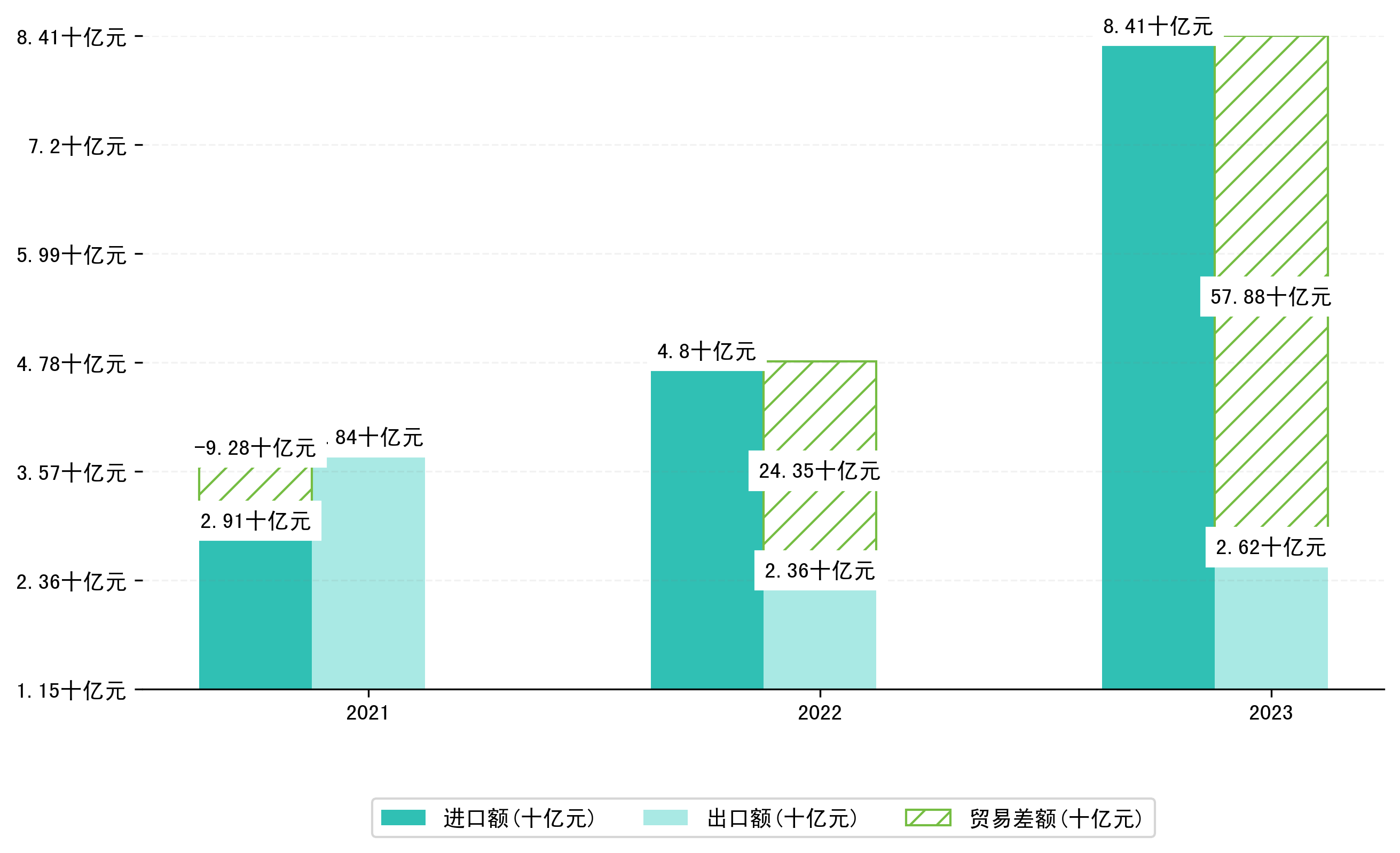 以美元计,2023年1-3月哈尔滨市贸易差额为8,3547,1990万美元(贸易逆差),相比上年同期减少了4,5331,6080万美元,同比减少118.62%。
