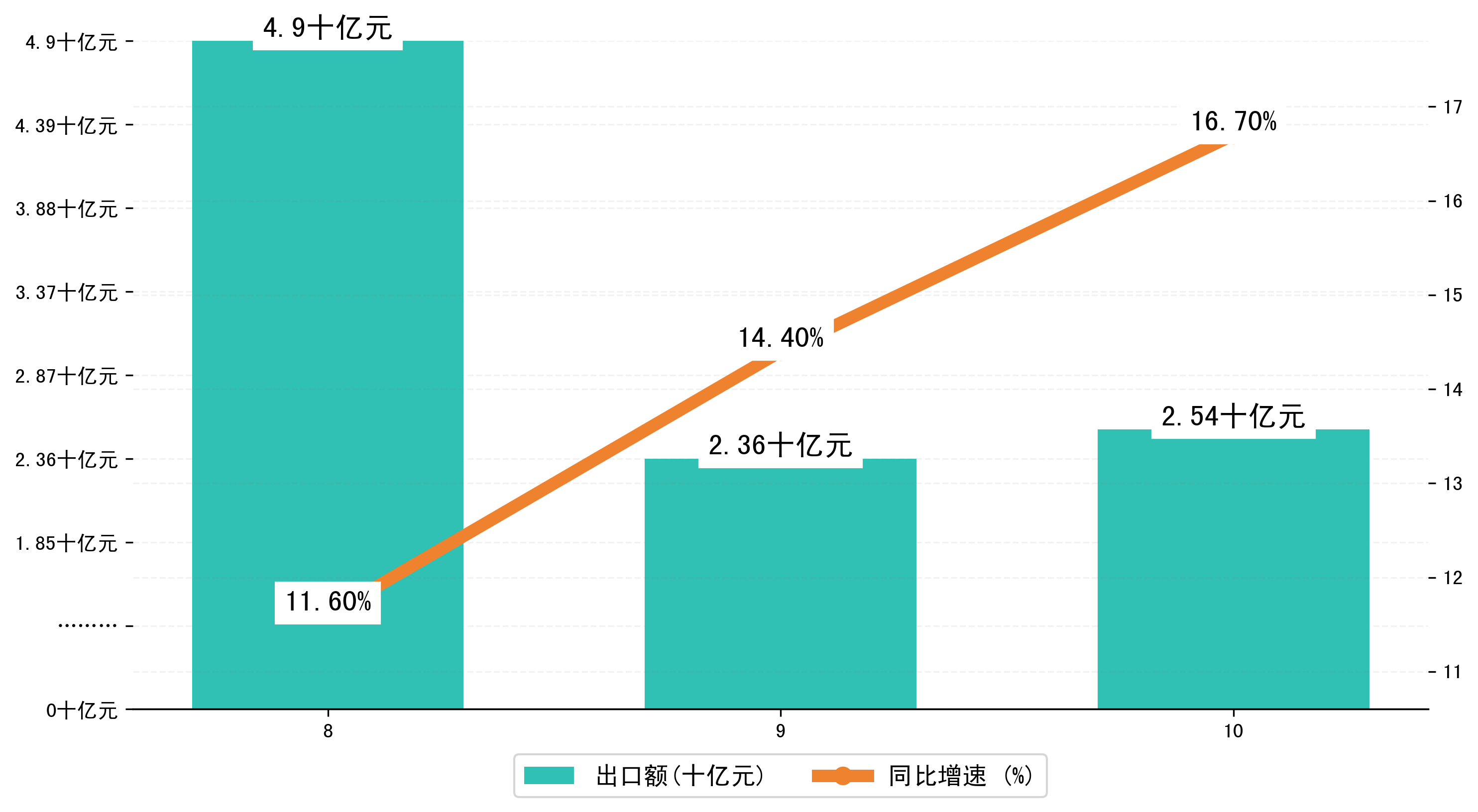 以人民币计,2024年10月海口市出口额为25,3511.3669万元,相比上月增加了1,7603.8744万元;相比上年同期增加了7,8494.5499万元,同比增加了16.70%。