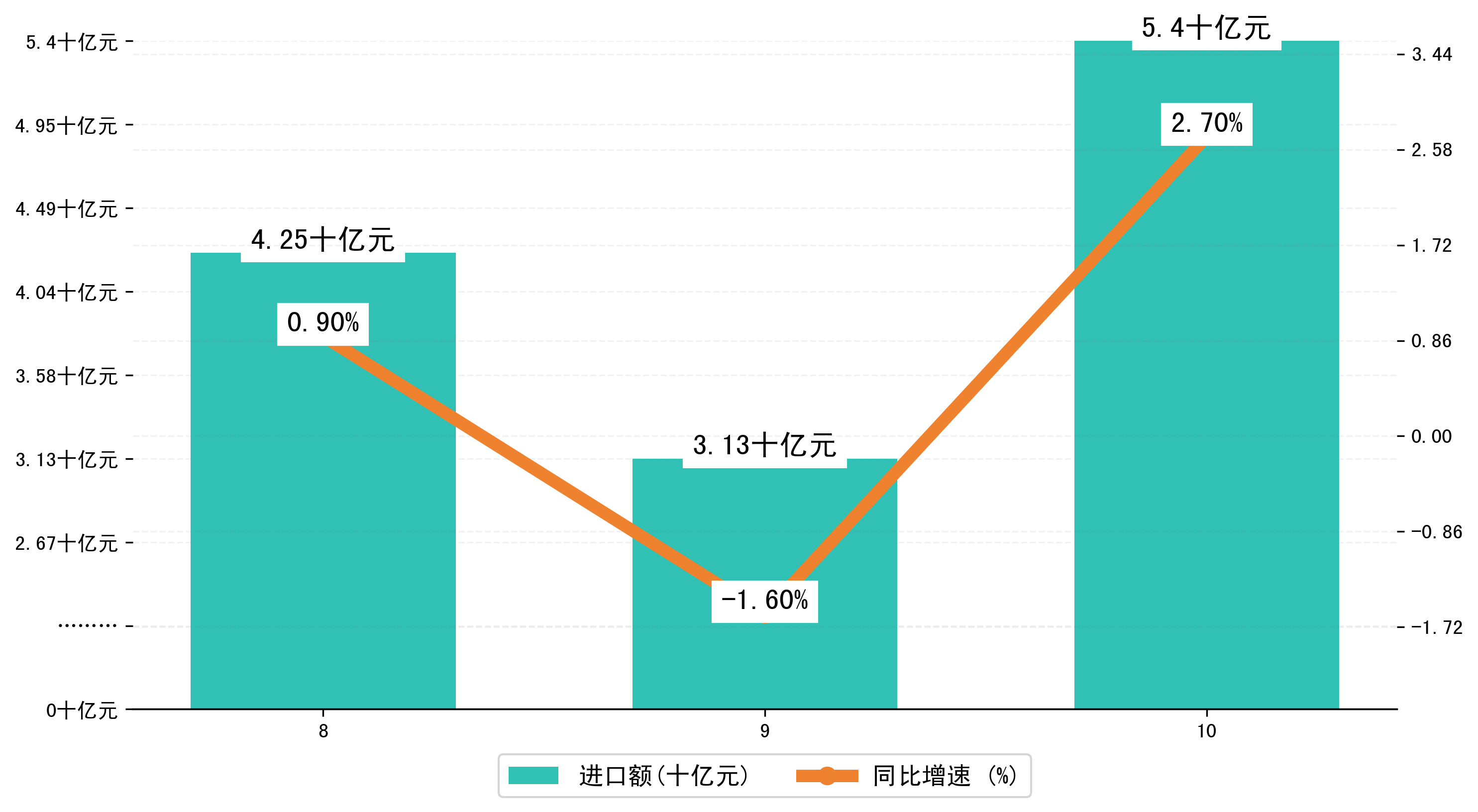 以人民币计,2024年10月海口市进口额为54,0080.0641万元,相比上月增加了22,7579.8069万元;相比上年同期增加了16,9225.6837万元,同比增加了2.70%。