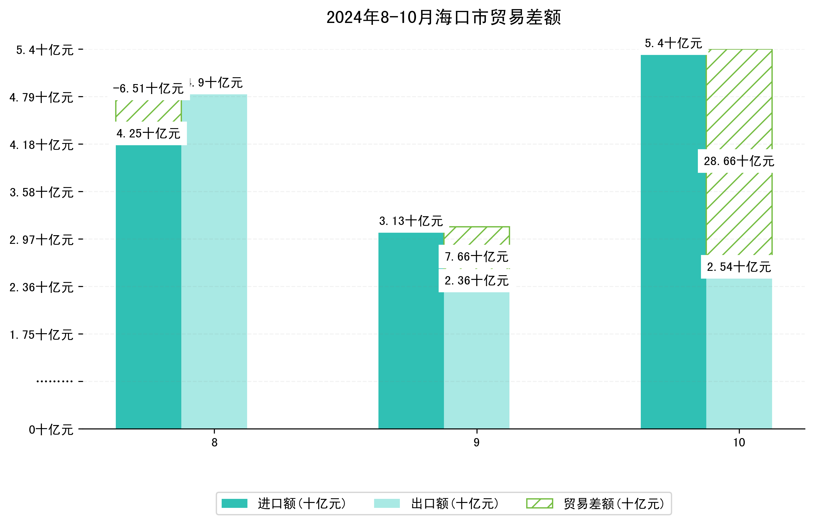 以人民币计,2024年10月海口市贸易差额为28,6568,6972万元(贸易逆差),相比上月减少了20,9975,9325万元,即2,9885,6198万美元;相比上年同期减少了9,0731,1338万元,同比减少46.33%。