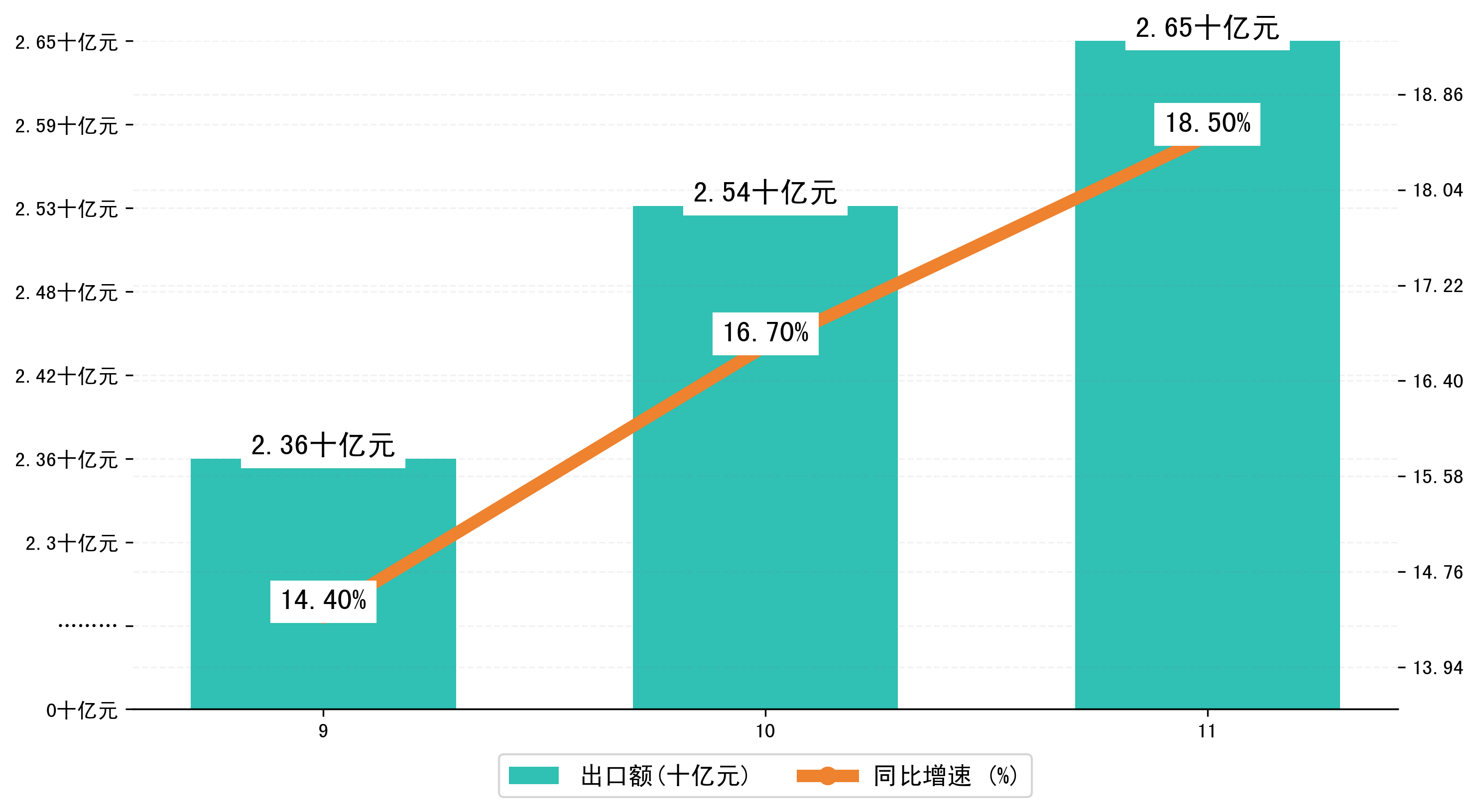 以人民币计,2024年11月海口市出口额为26,5010.0569万元,相比上月增加了1,1498.69万元;相比上年同期增加了7,6874.9866万元,同比增加了18.50%。