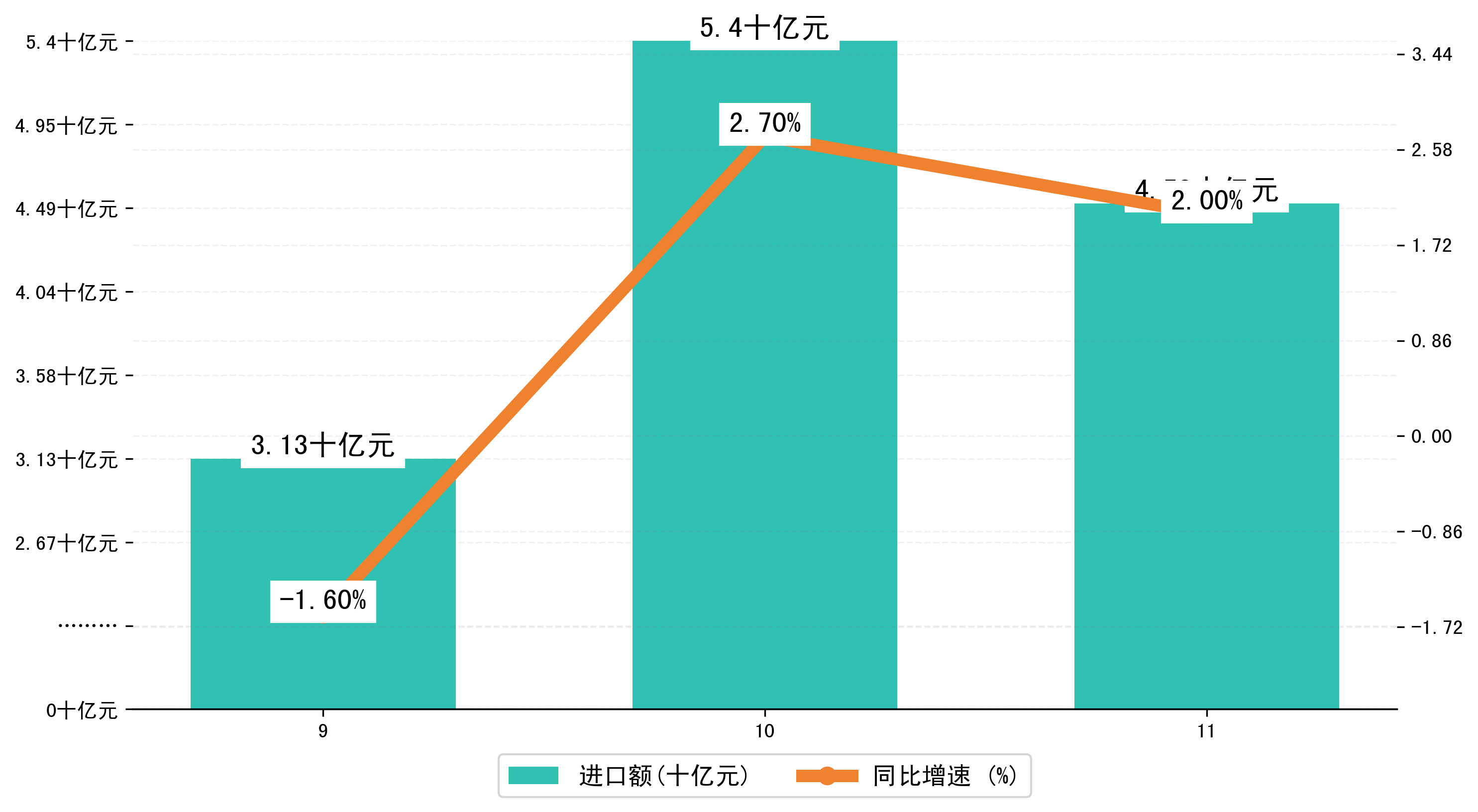 以人民币计,2024年1-11月海口市进口额为464,2367.3068万元,相比上年同期增加了9,8879.5373万元,同比增加了2.00%。