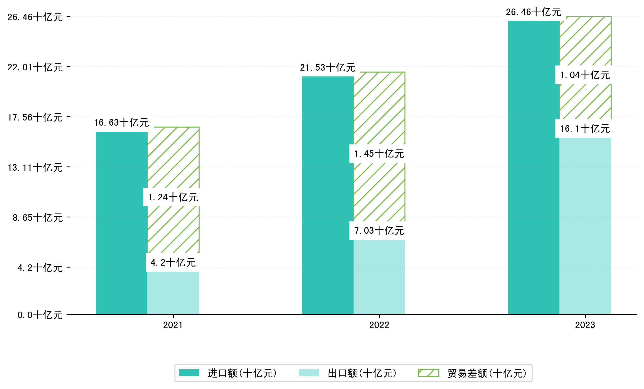 以人民币计,2023年1-6月海口市贸易差额为103,6399,2277万元(贸易逆差),相比上年同期增加了41,3671,8667万元,同比增加-28.53%。
